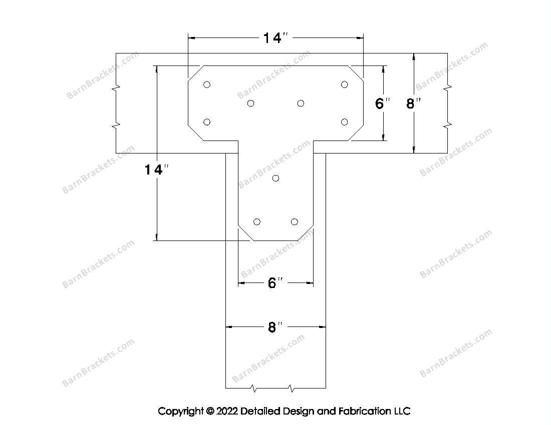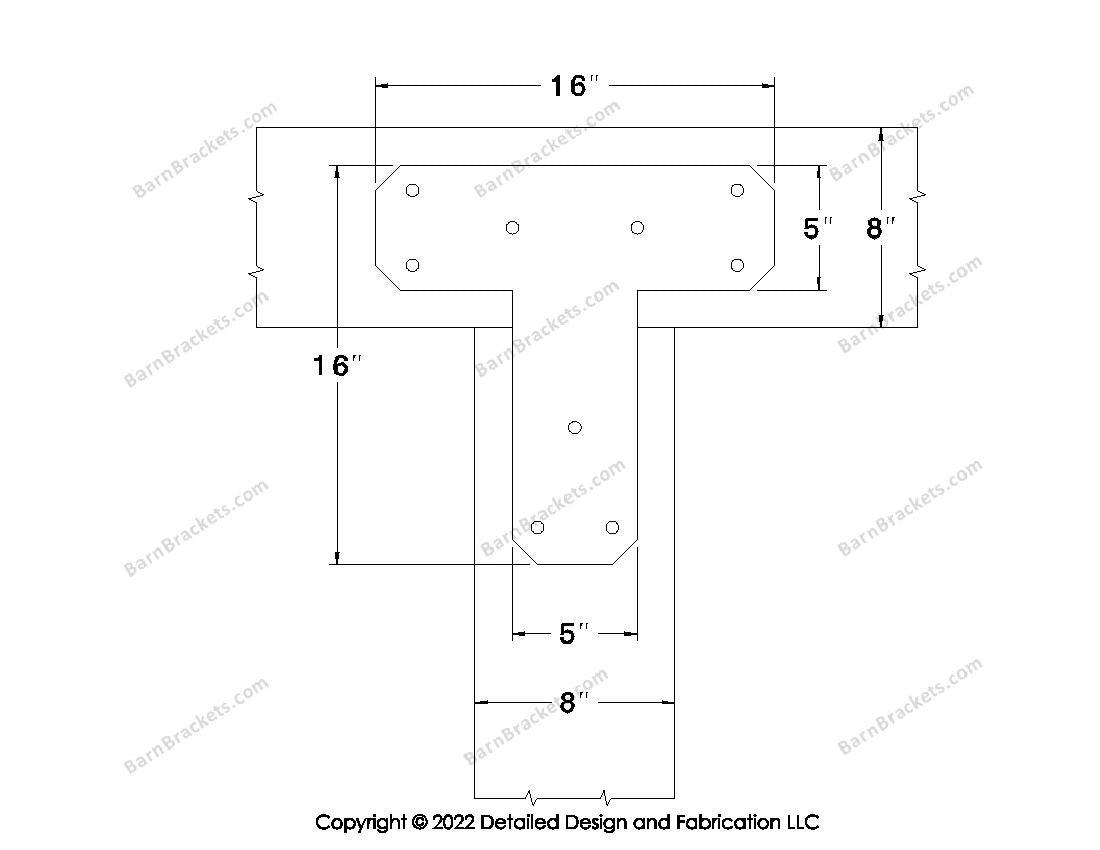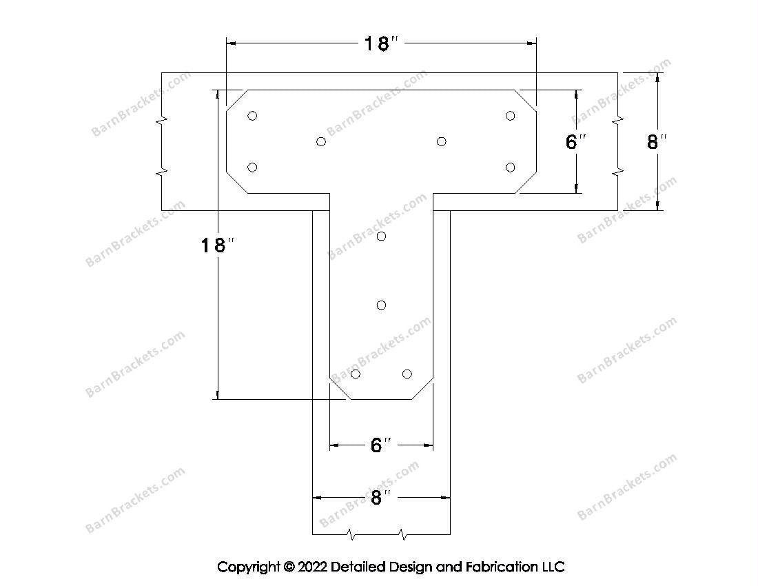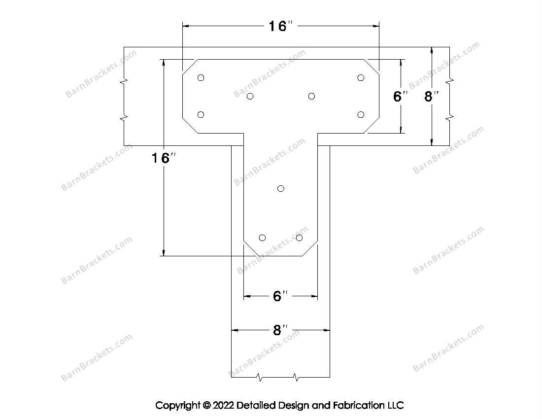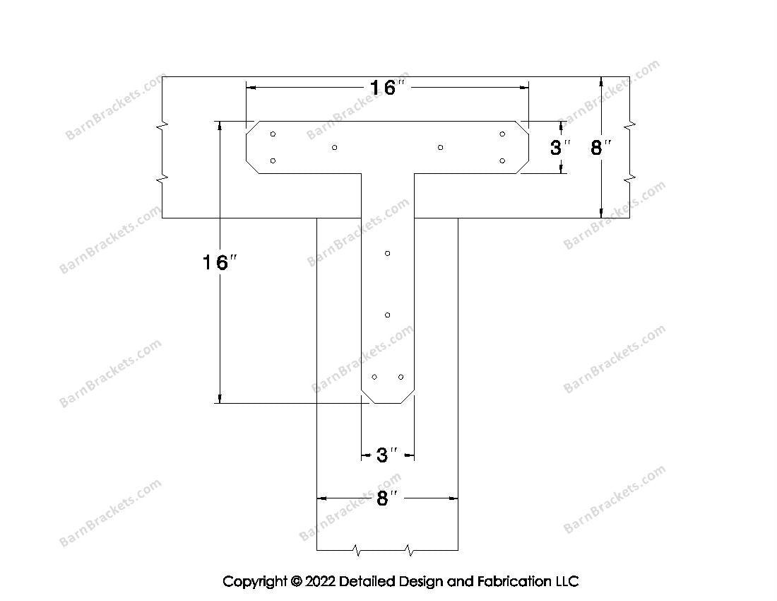 T shaped Brackets for 8 inch beams - Chamfered - Triangular style holes - BarnBrackets.com