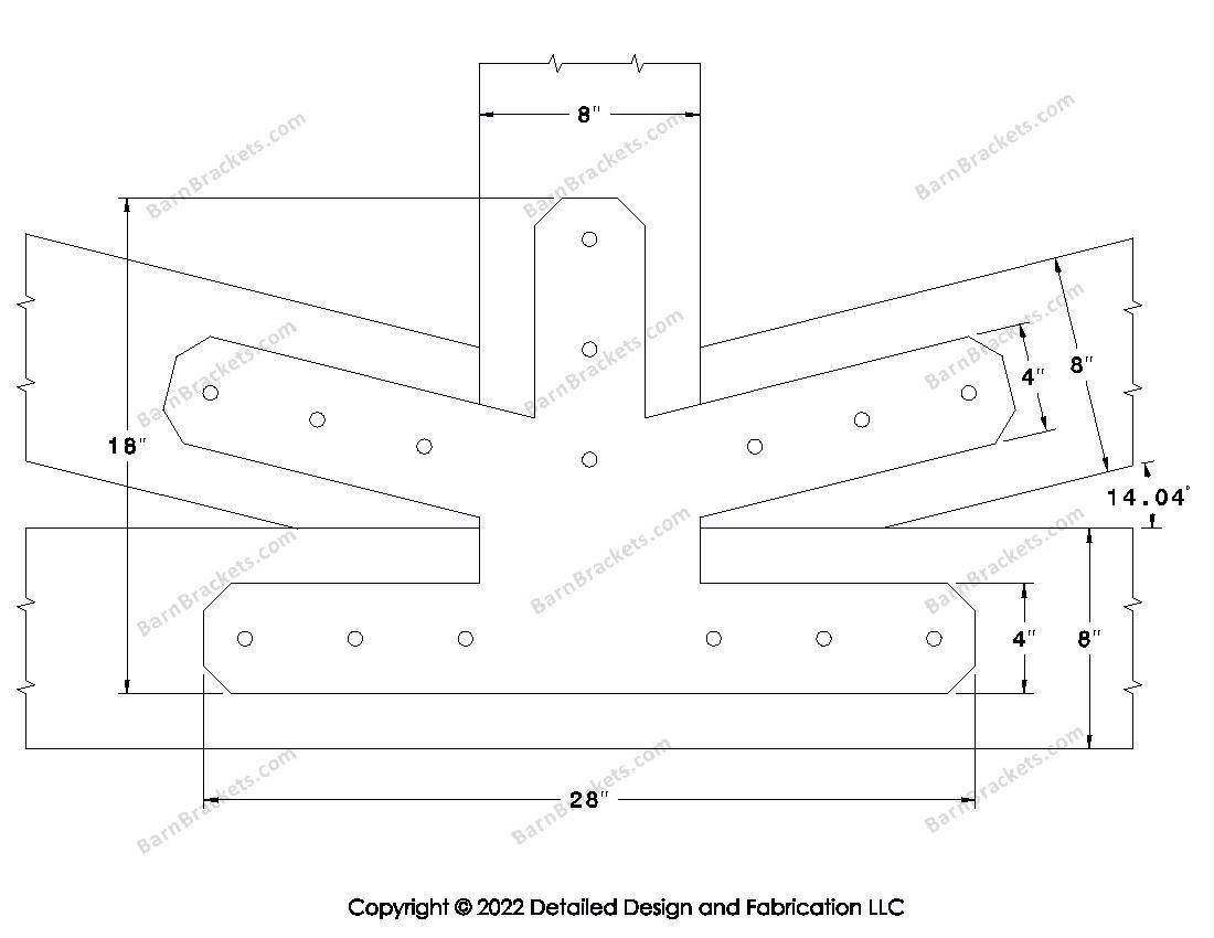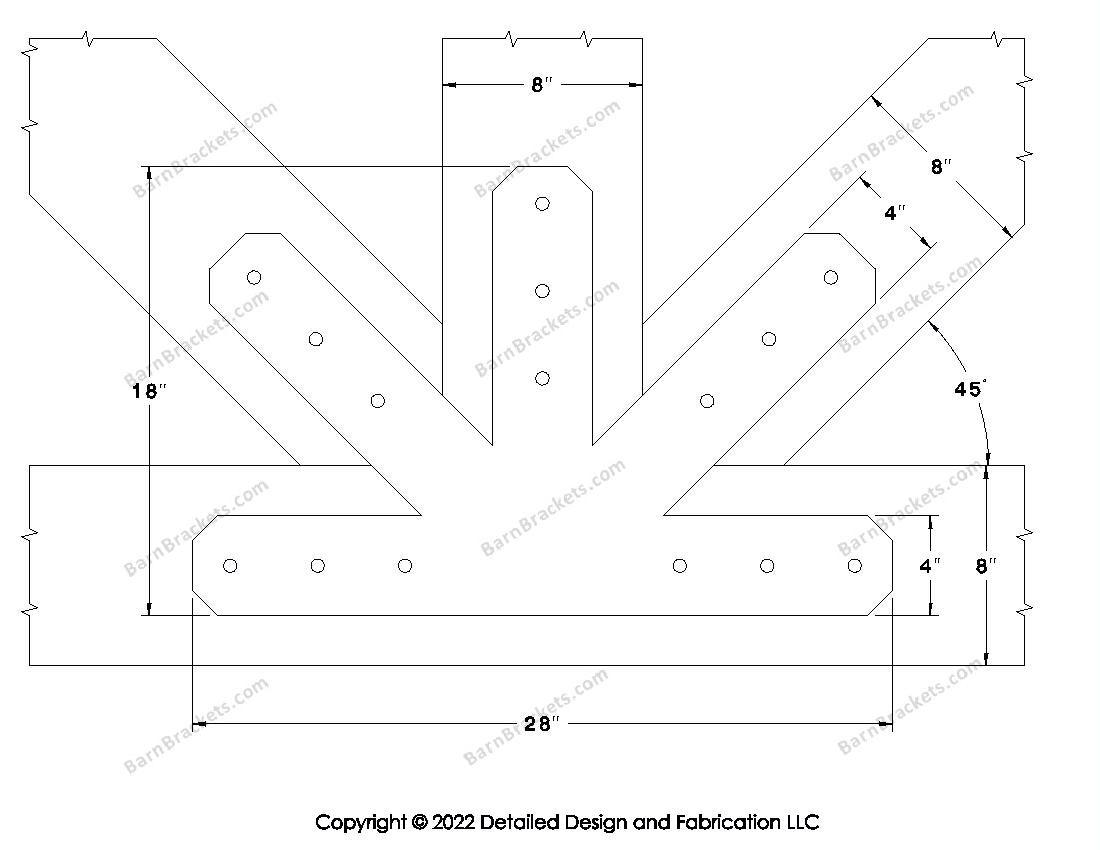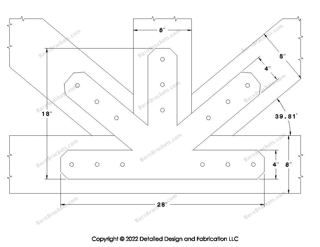 Fan Brackets for 8 inch beams - 4 inch Large centered joint - Chamfered - Centered style holes - BarnBrackets.com