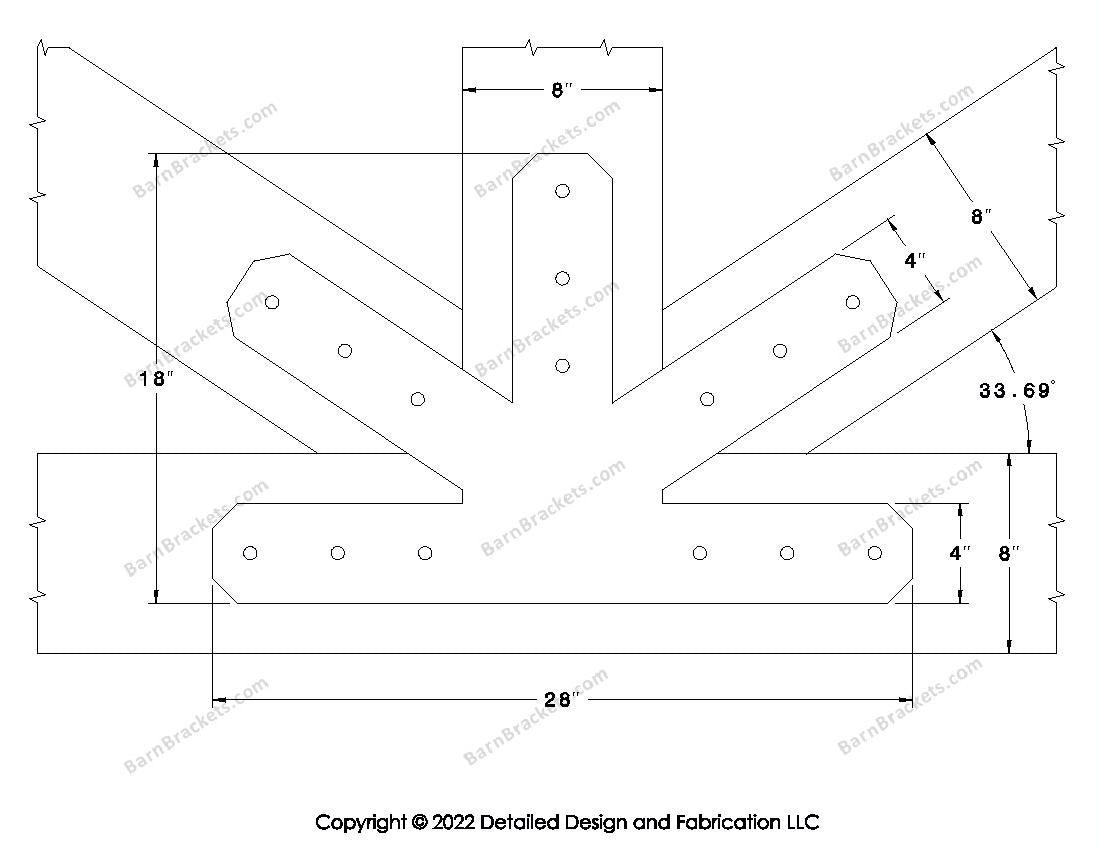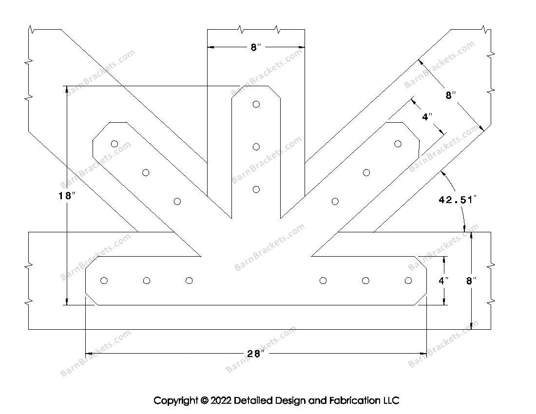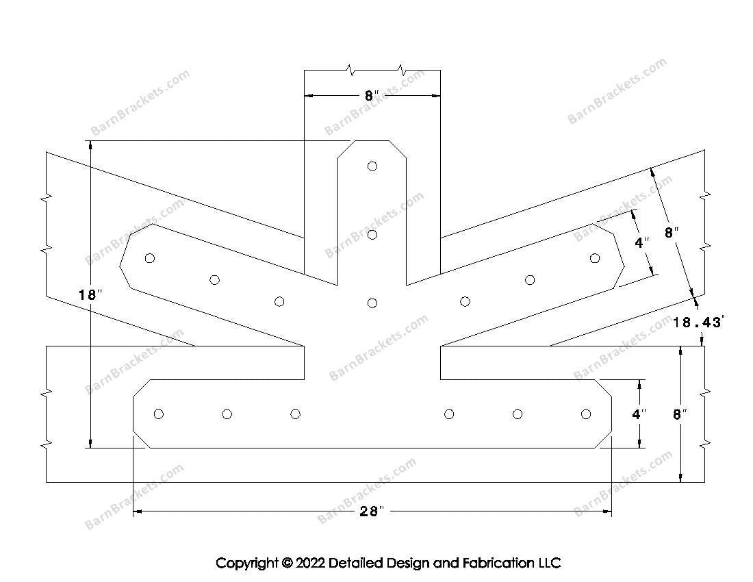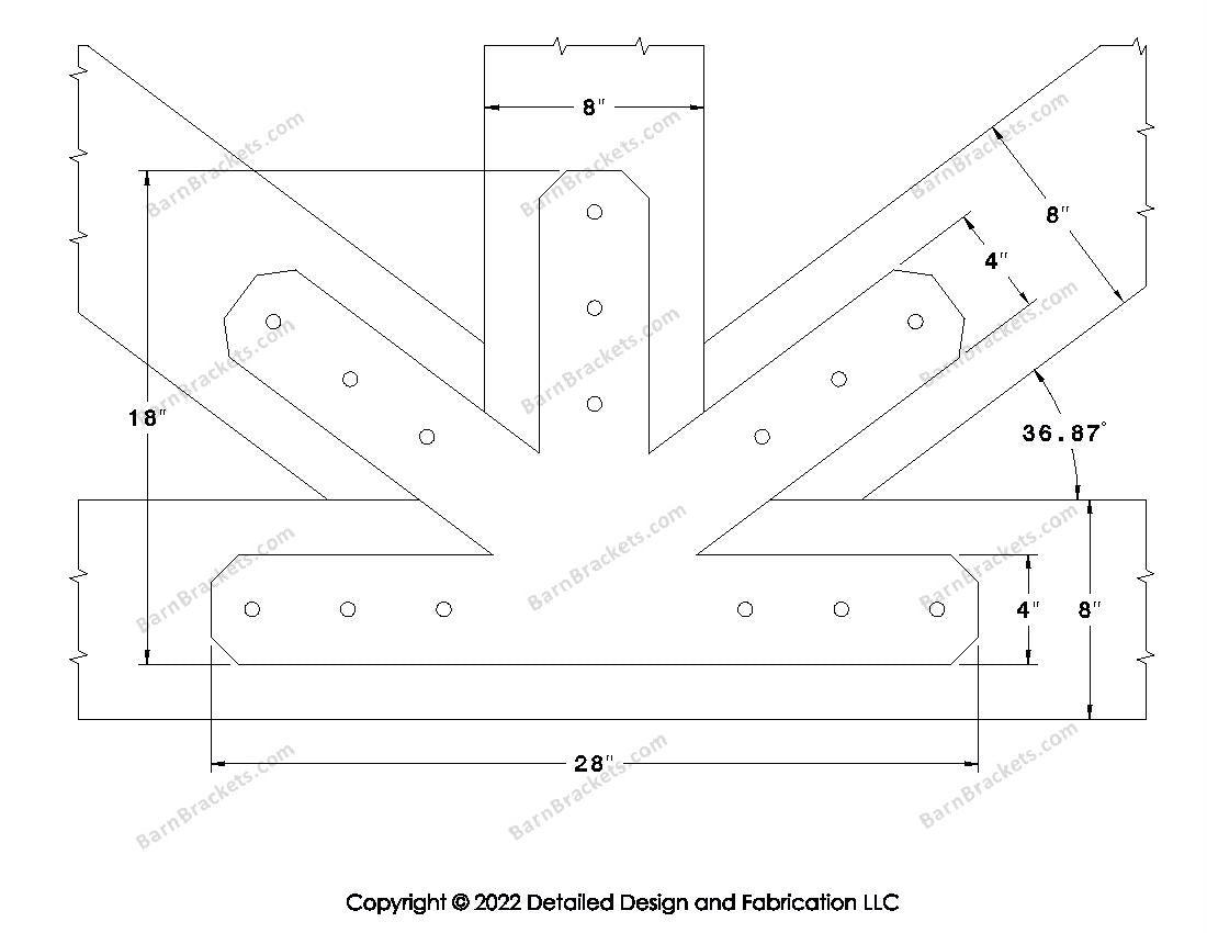 Fan Brackets for 8 inch beams - 4 inch Large centered joint - Chamfered - Centered style holes - BarnBrackets.com