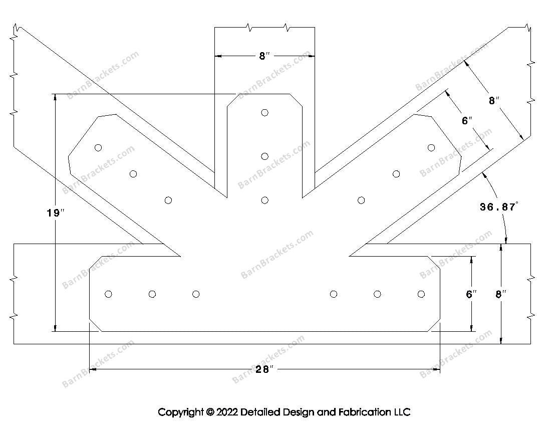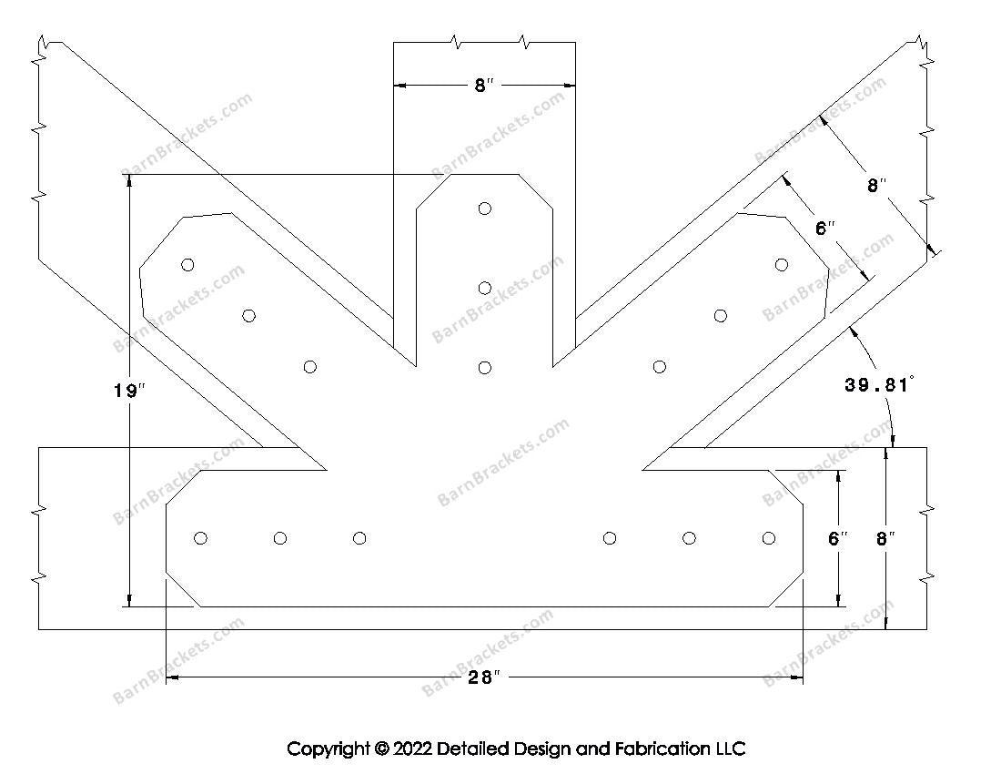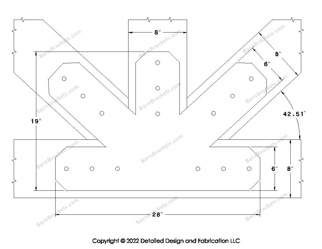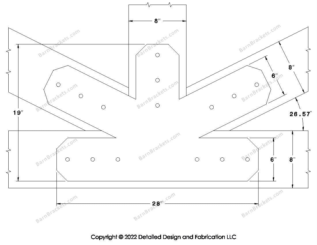 Fan Brackets for 8 inch beams - 6 inch Large centered joint - Chamfered - Centered style holes - BarnBrackets.com
