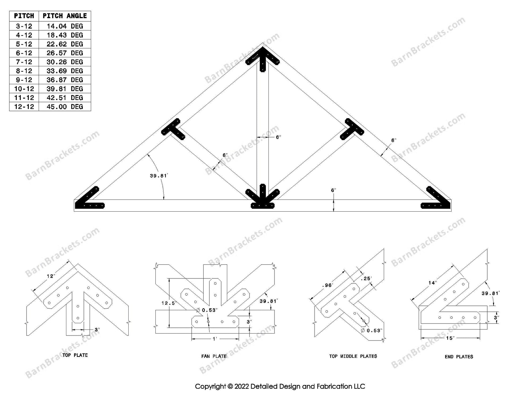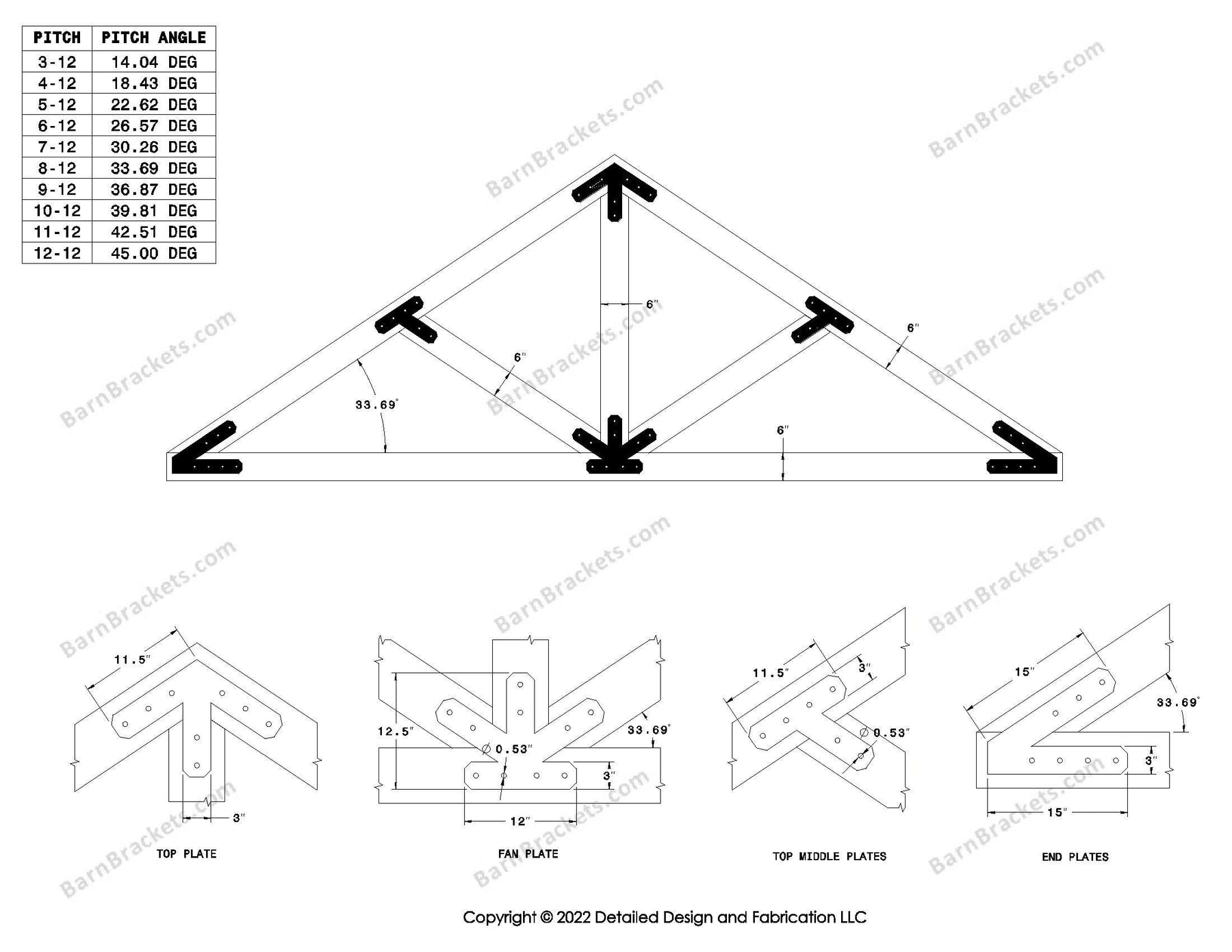 Steel timber truss bracket set for a 6/12 pitch roof.