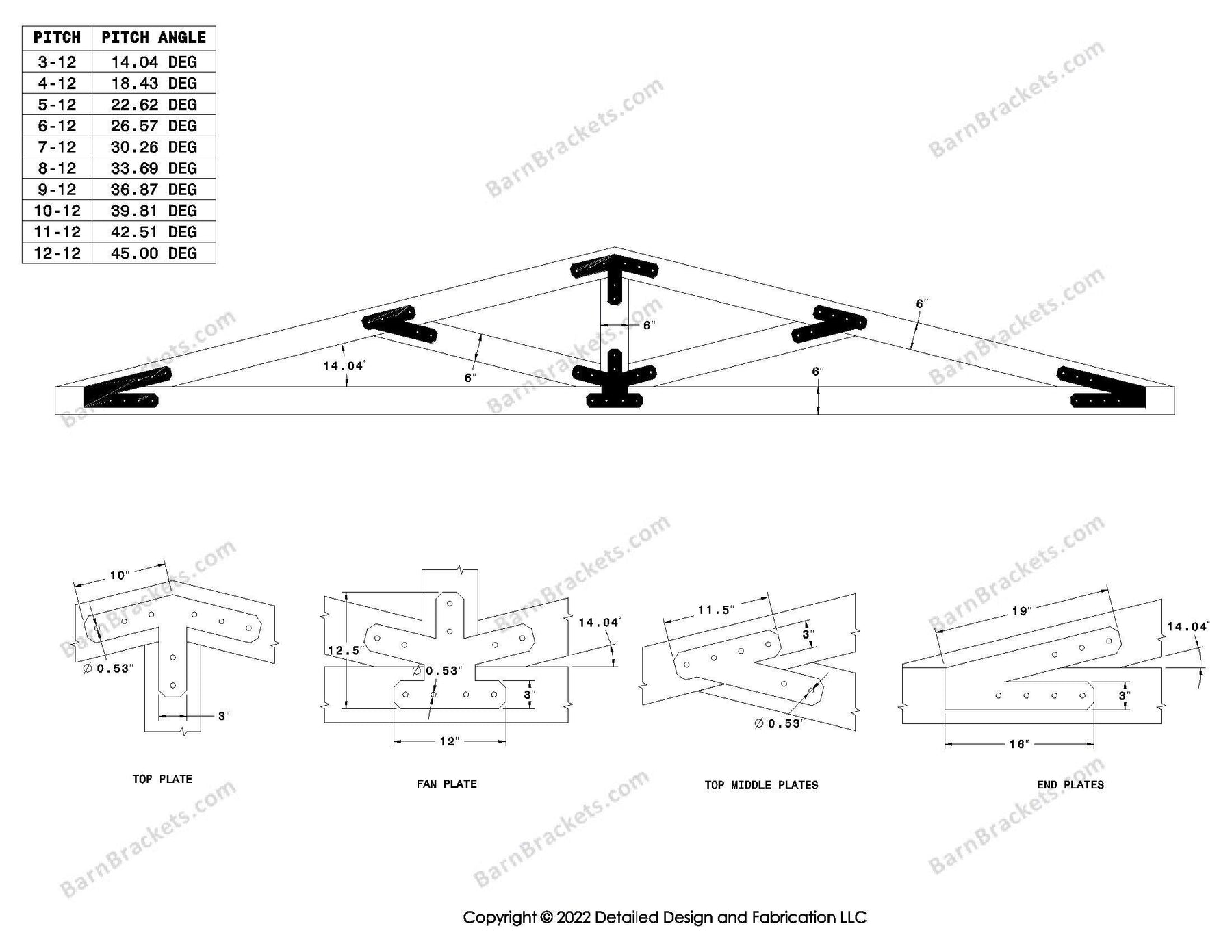 Steel timber truss bracket set for a 3/12 pitch roof.