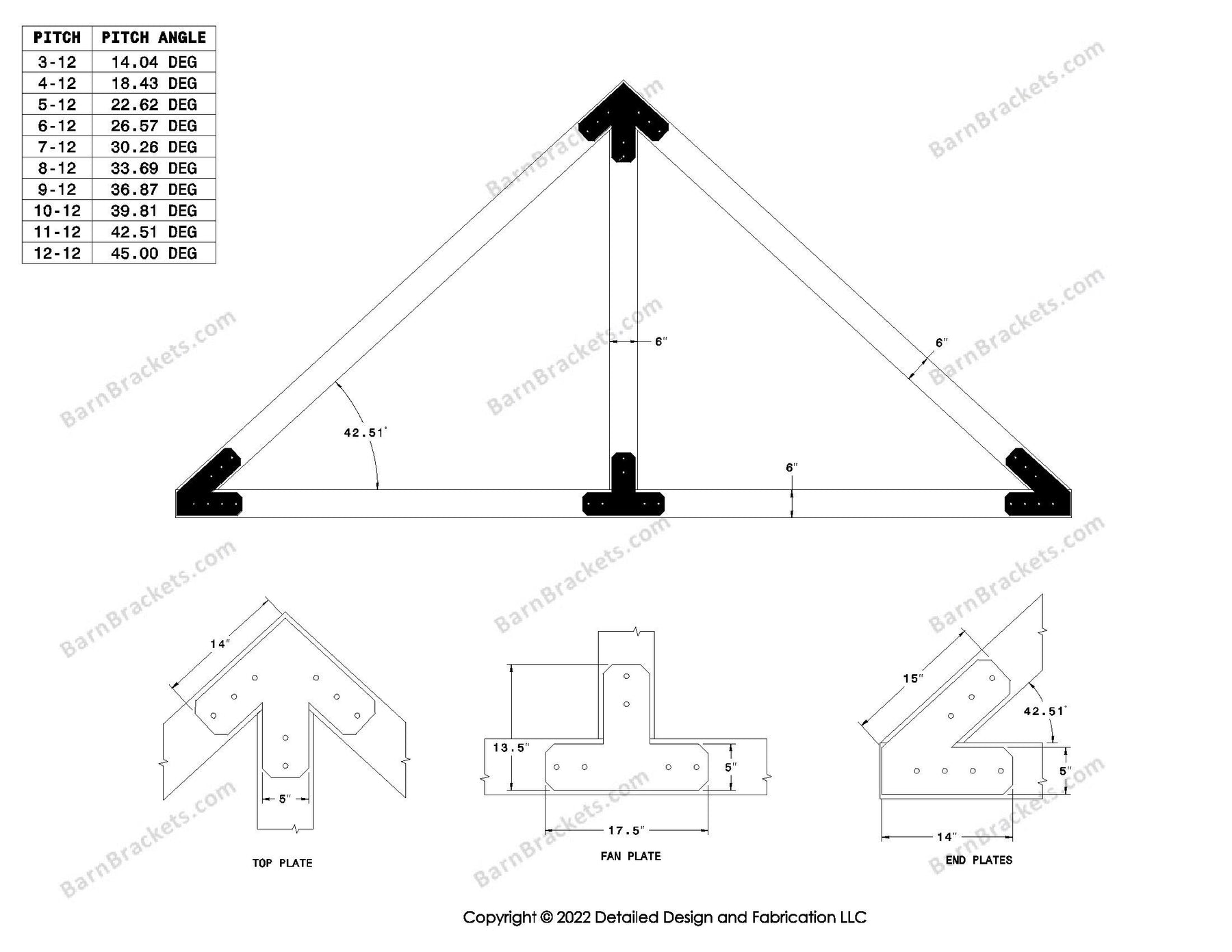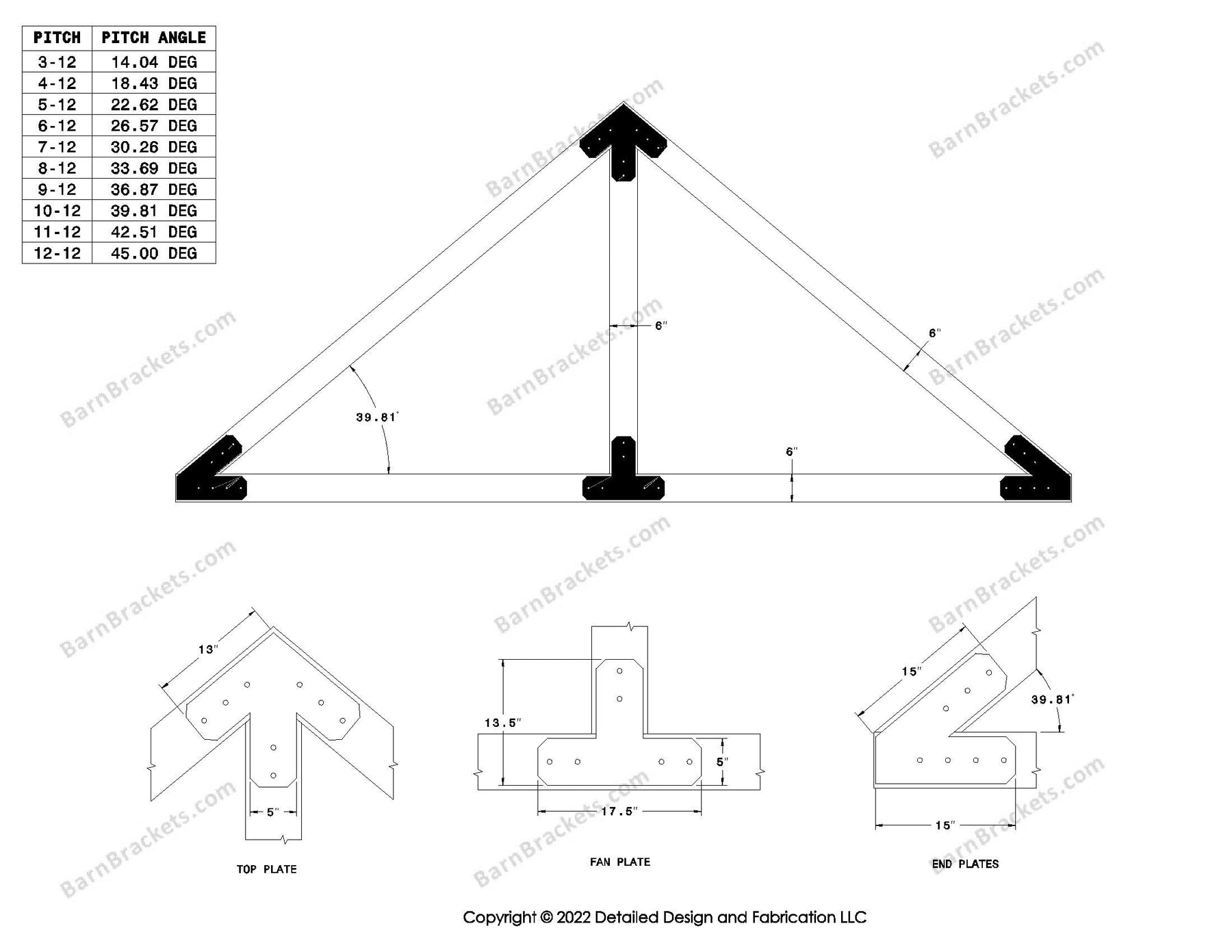 5 inch post and beam bracket set for 6 inch wood beams.  King post only truss.  With flush ends and chamfered corners.  For a 12-12 pitch roof.