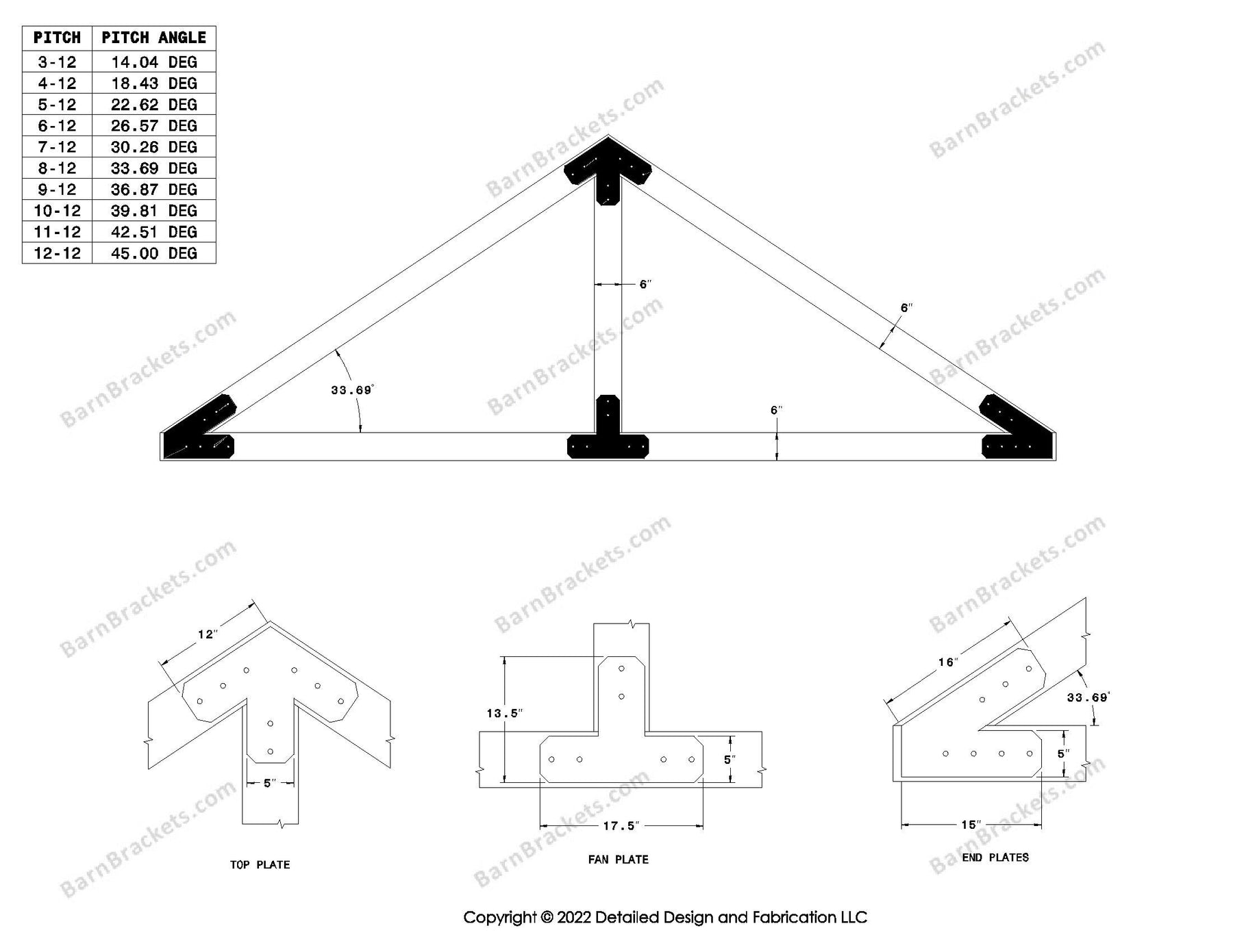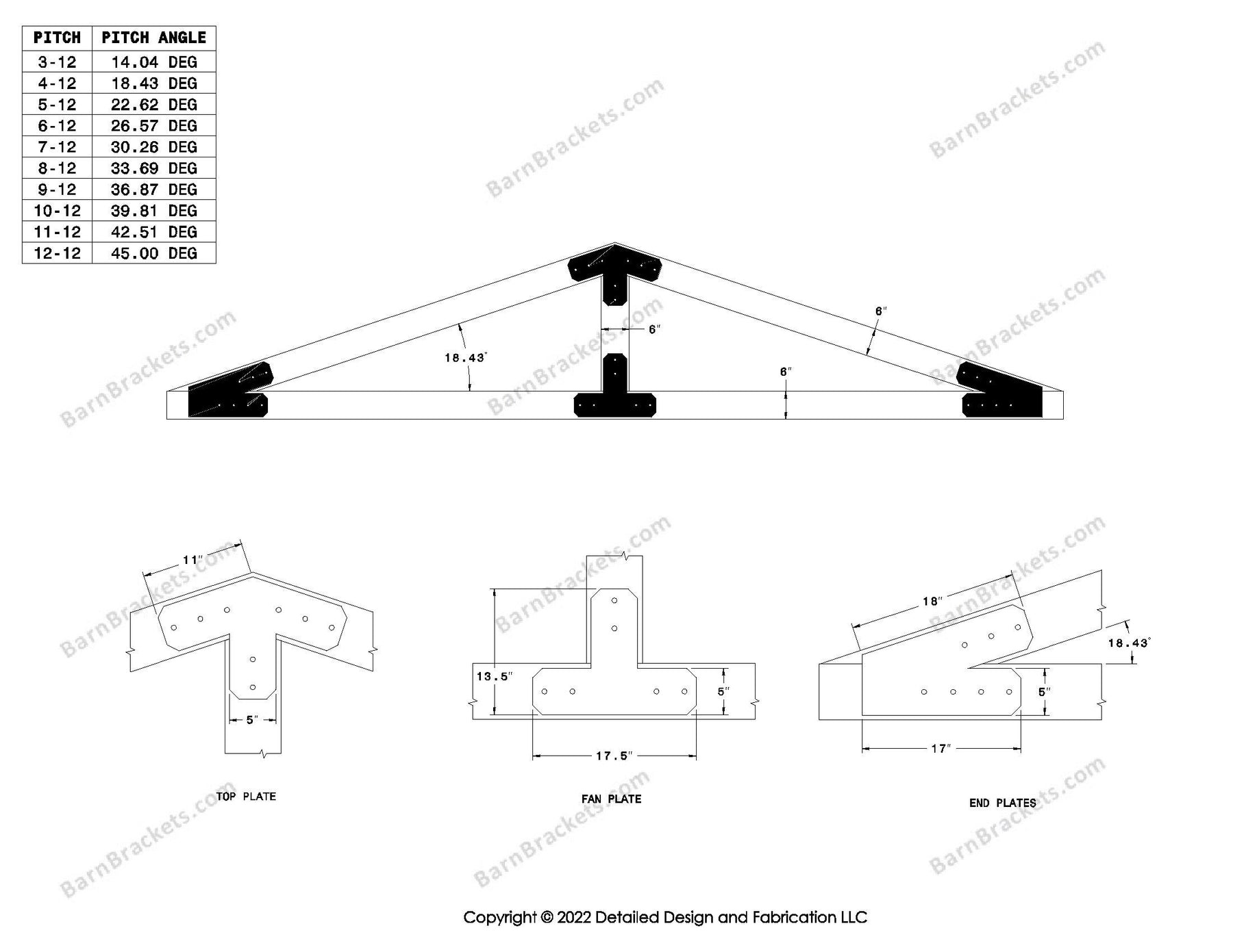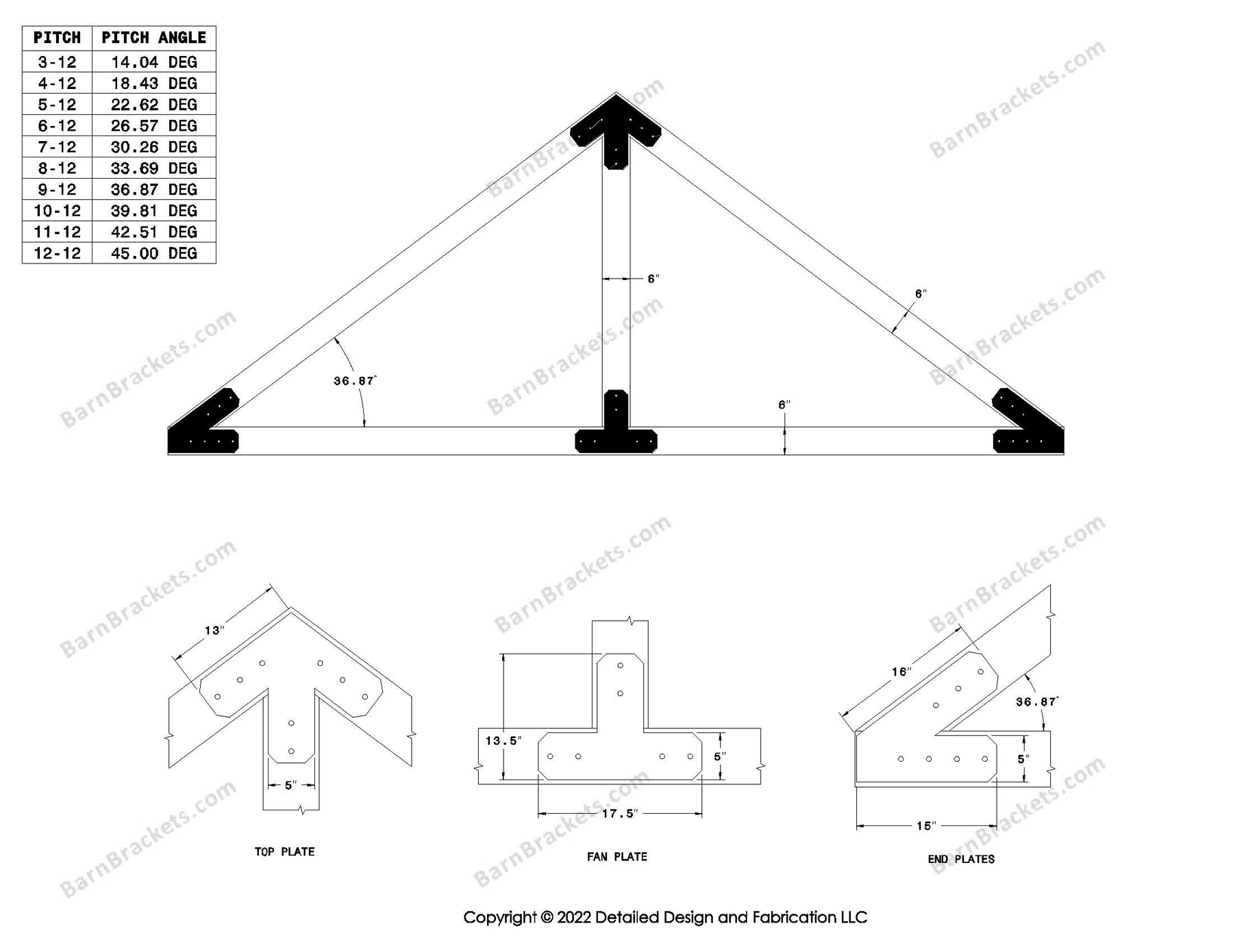 5 inch post and beam bracket set for 6 inch wood beams.  King post only truss.  With flush ends and chamfered corners.  For a 3-12 pitch roof.