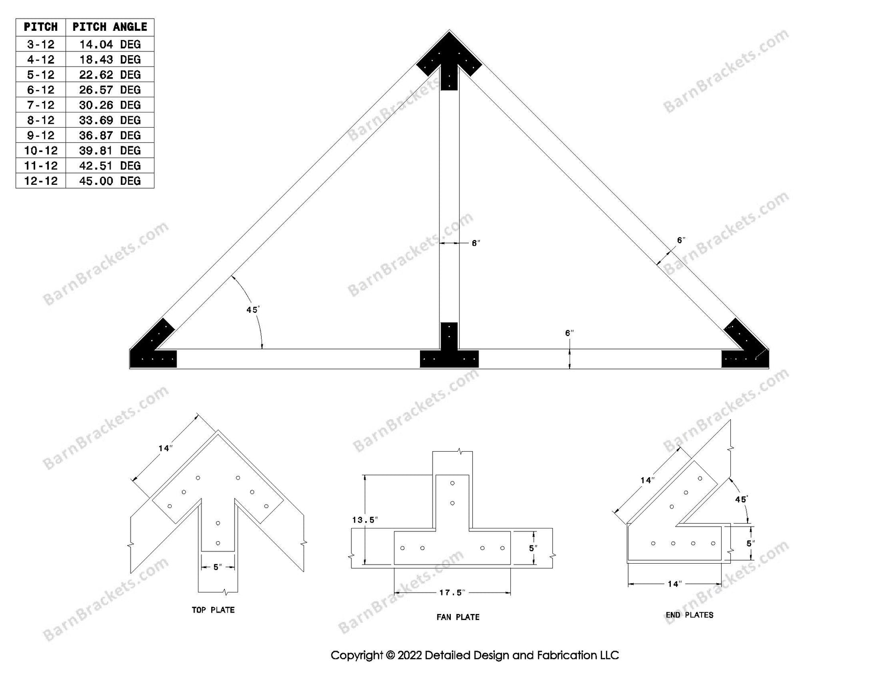 5 inch post and beam bracket set for 6 inch wood beams.  King post only truss.  With flush ends and square corners.  For a 12-12 pitch roof.