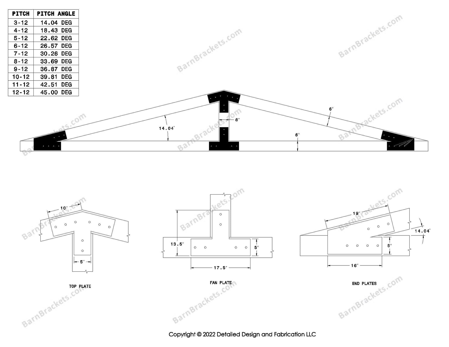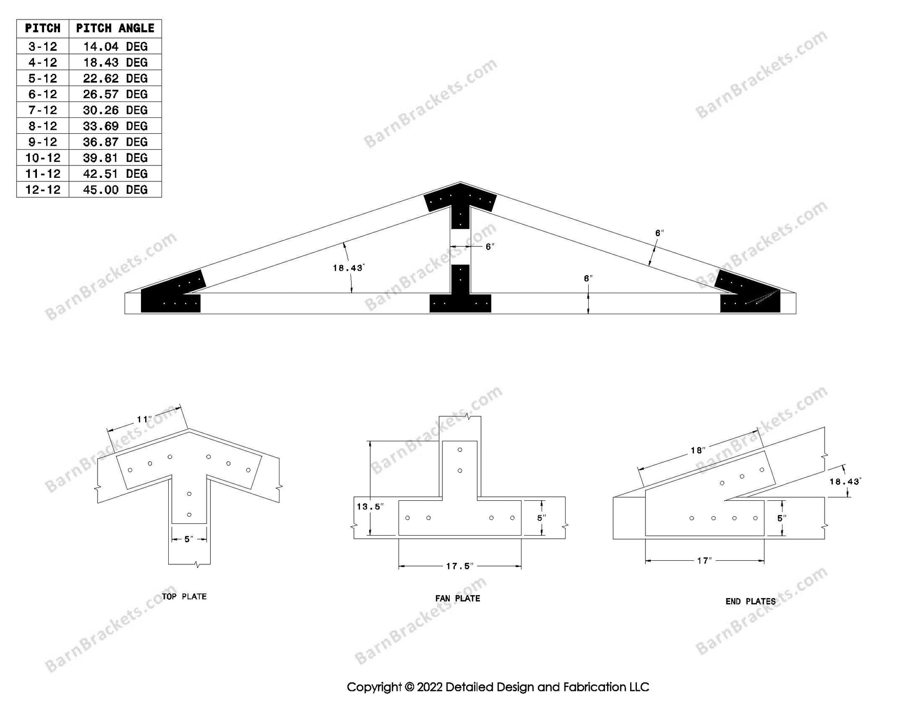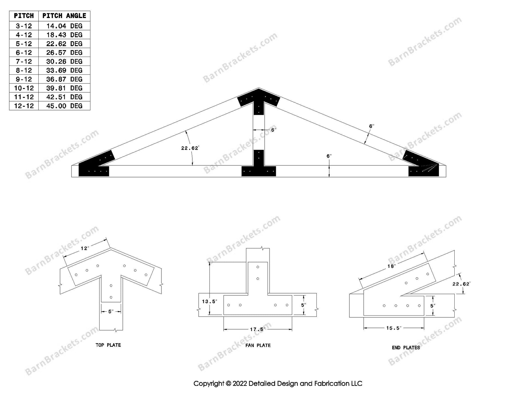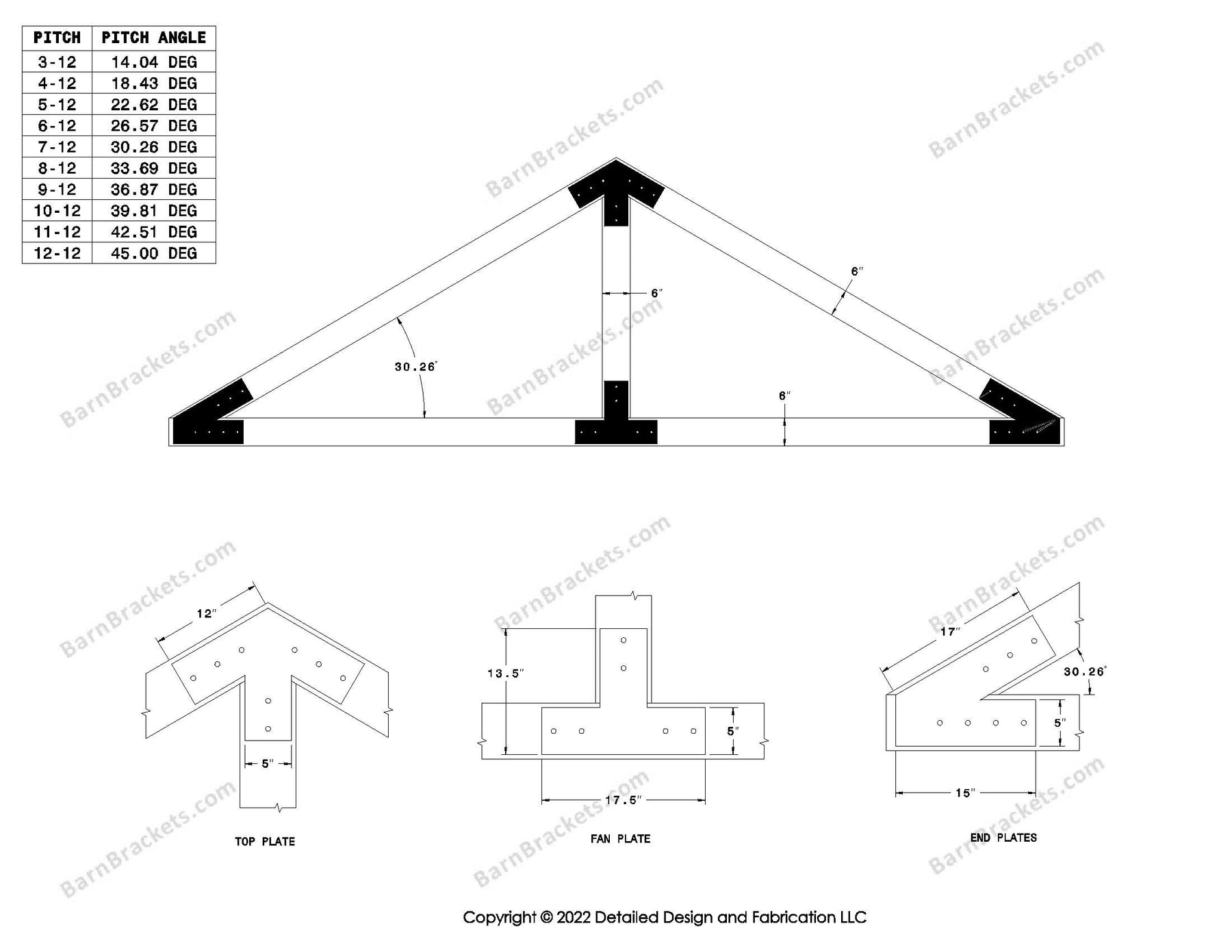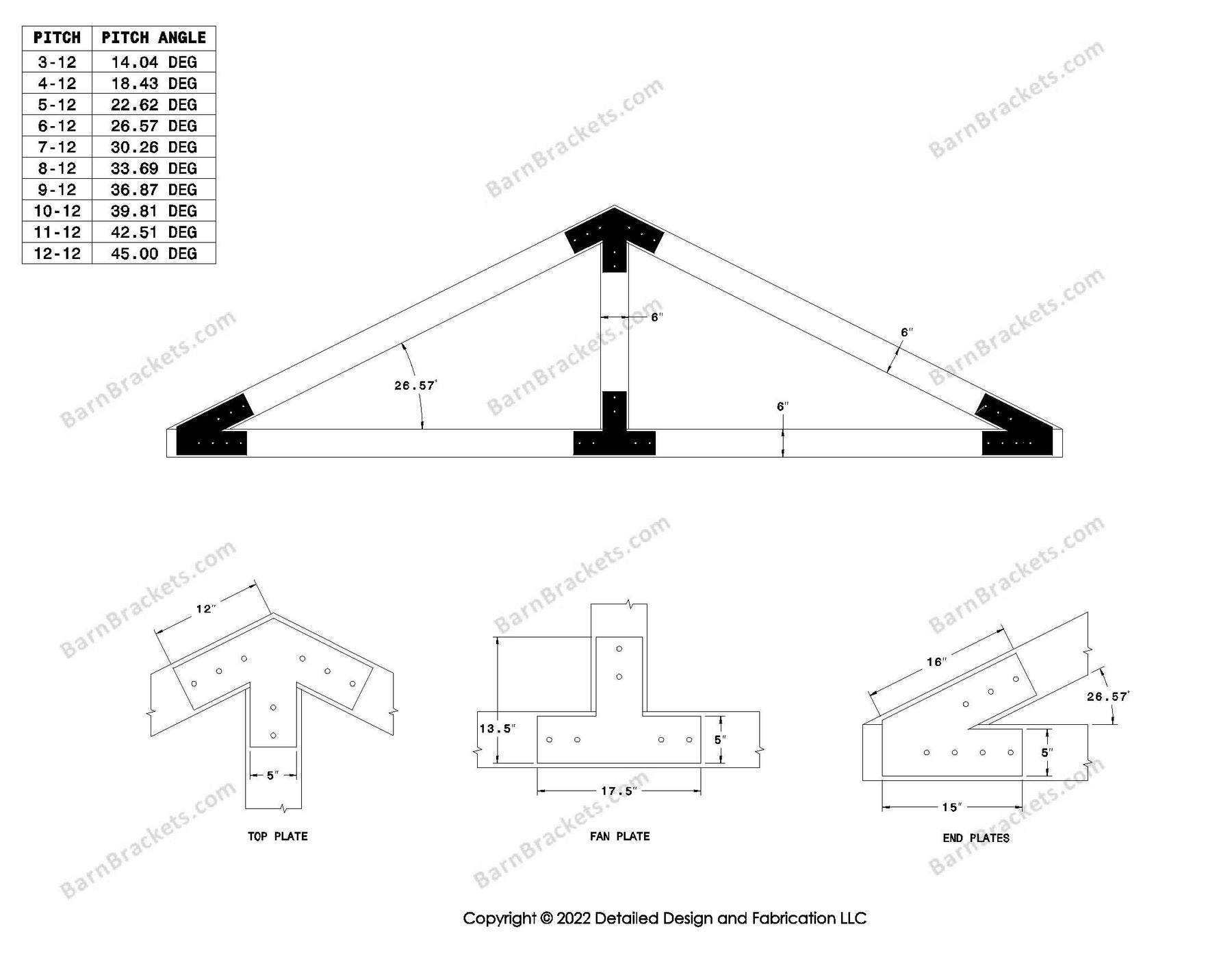 5 inch post and beam bracket set for 6 inch wood beams.  King post only truss.  With flush ends and square corners.  For a 3-12 pitch roof.