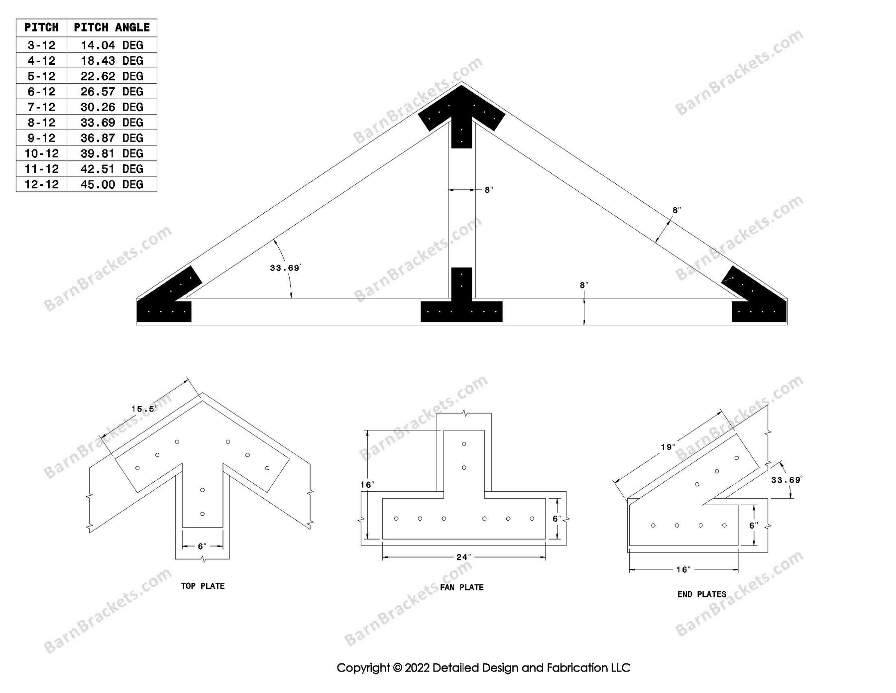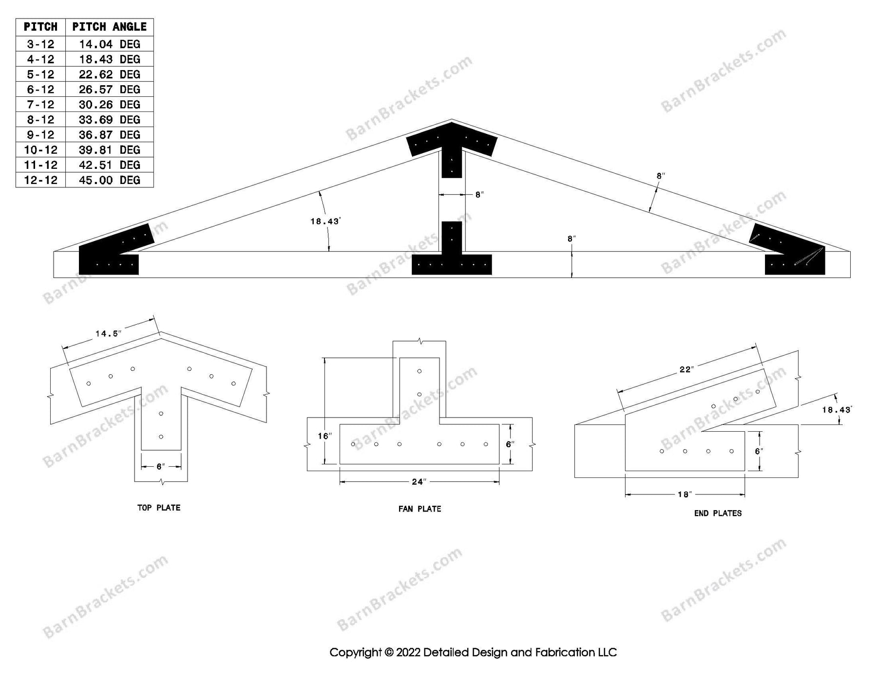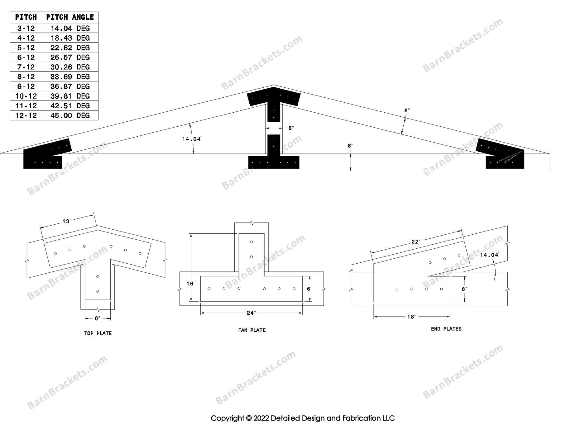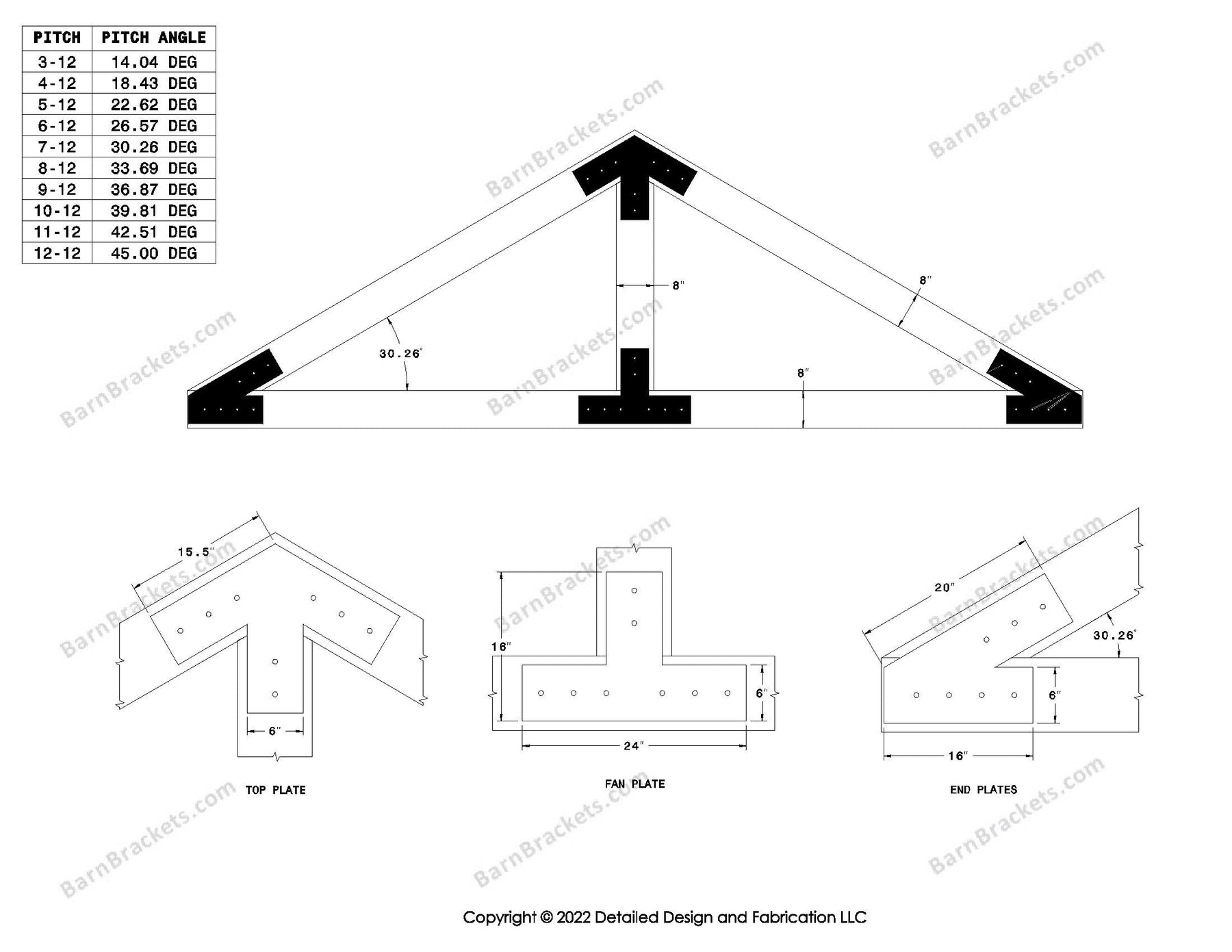 6 inch steel bracket kits for a post and beam truss.  These brackets are for 8 inch timber beams.  King post only truss.  Designed with flush ends and square corners.  Dimensions are for a 3-12 pitch roof.