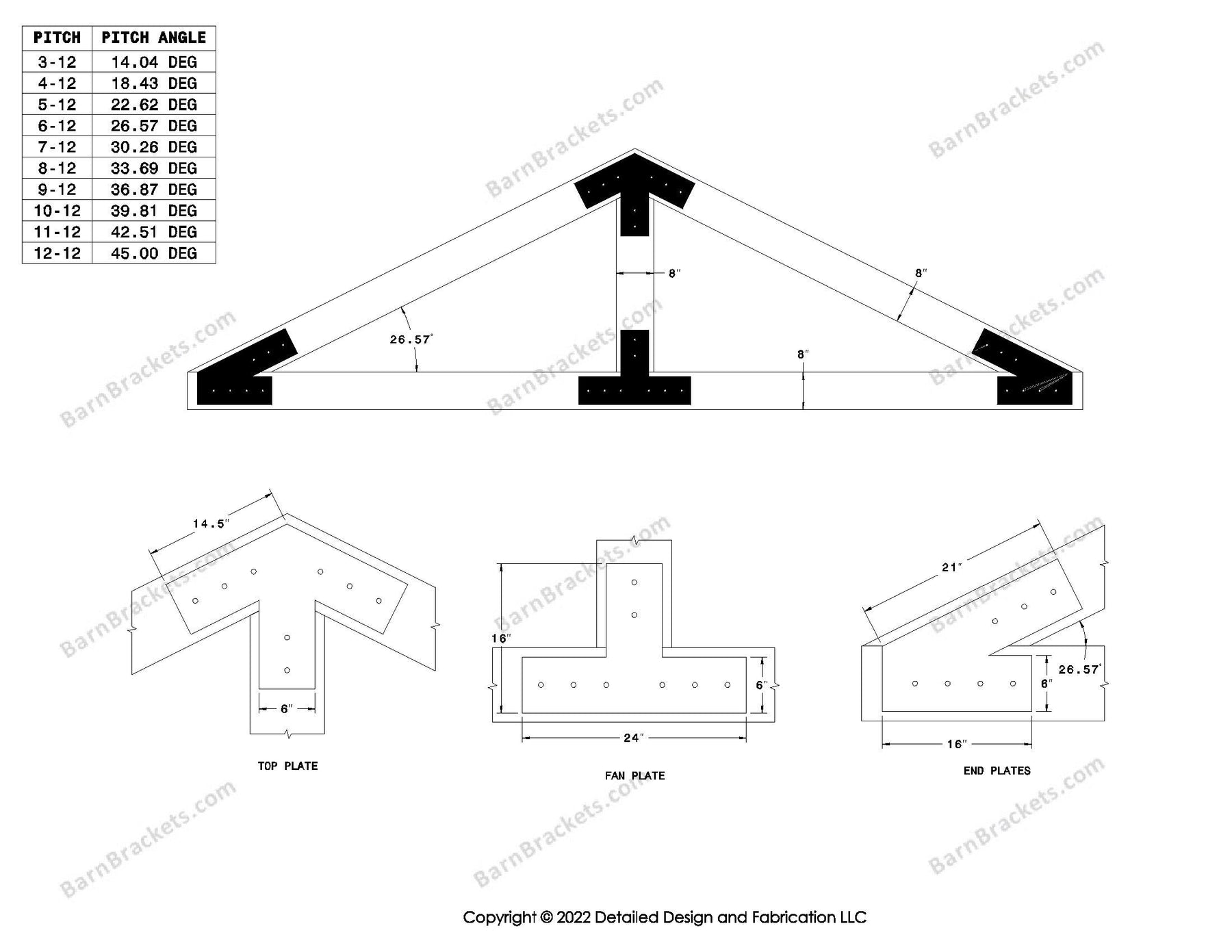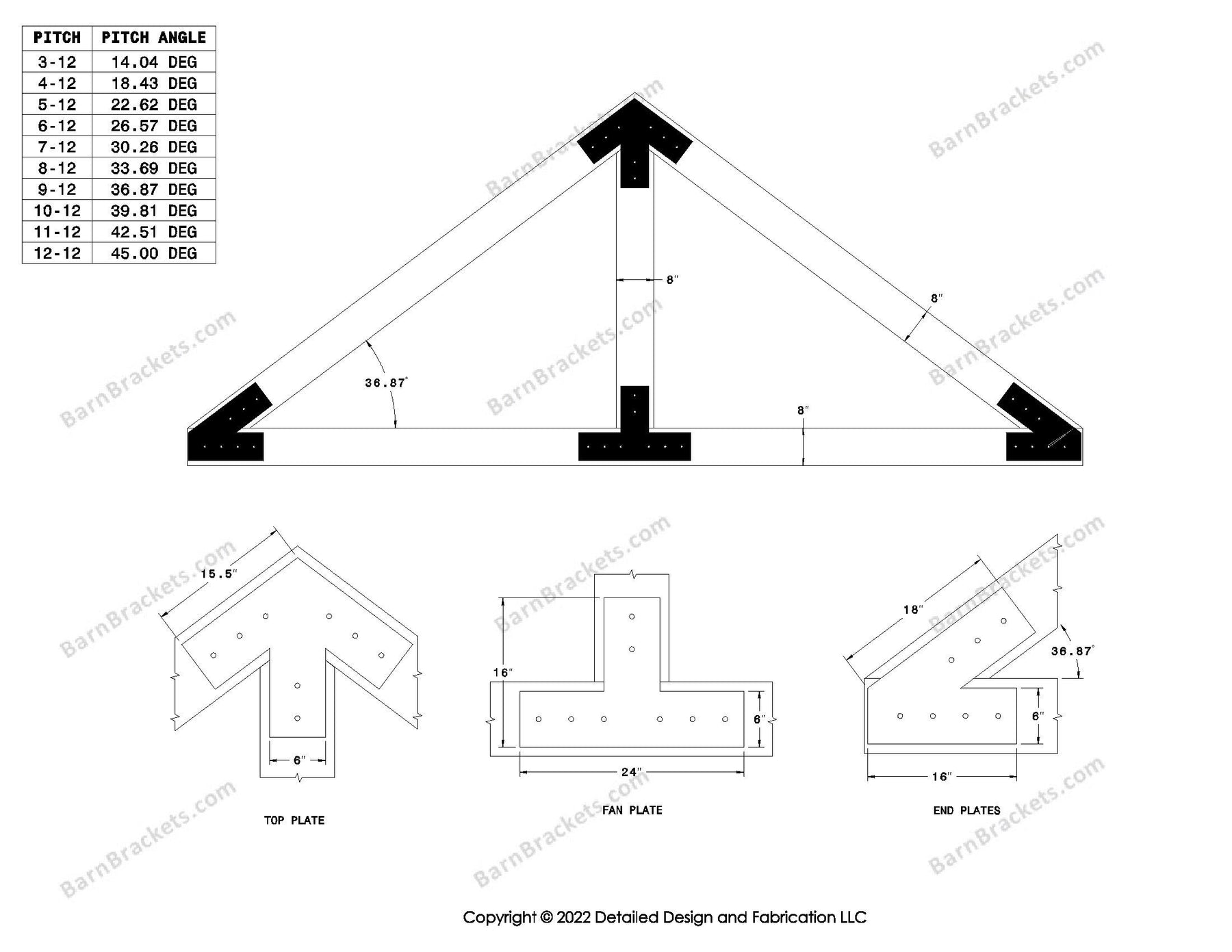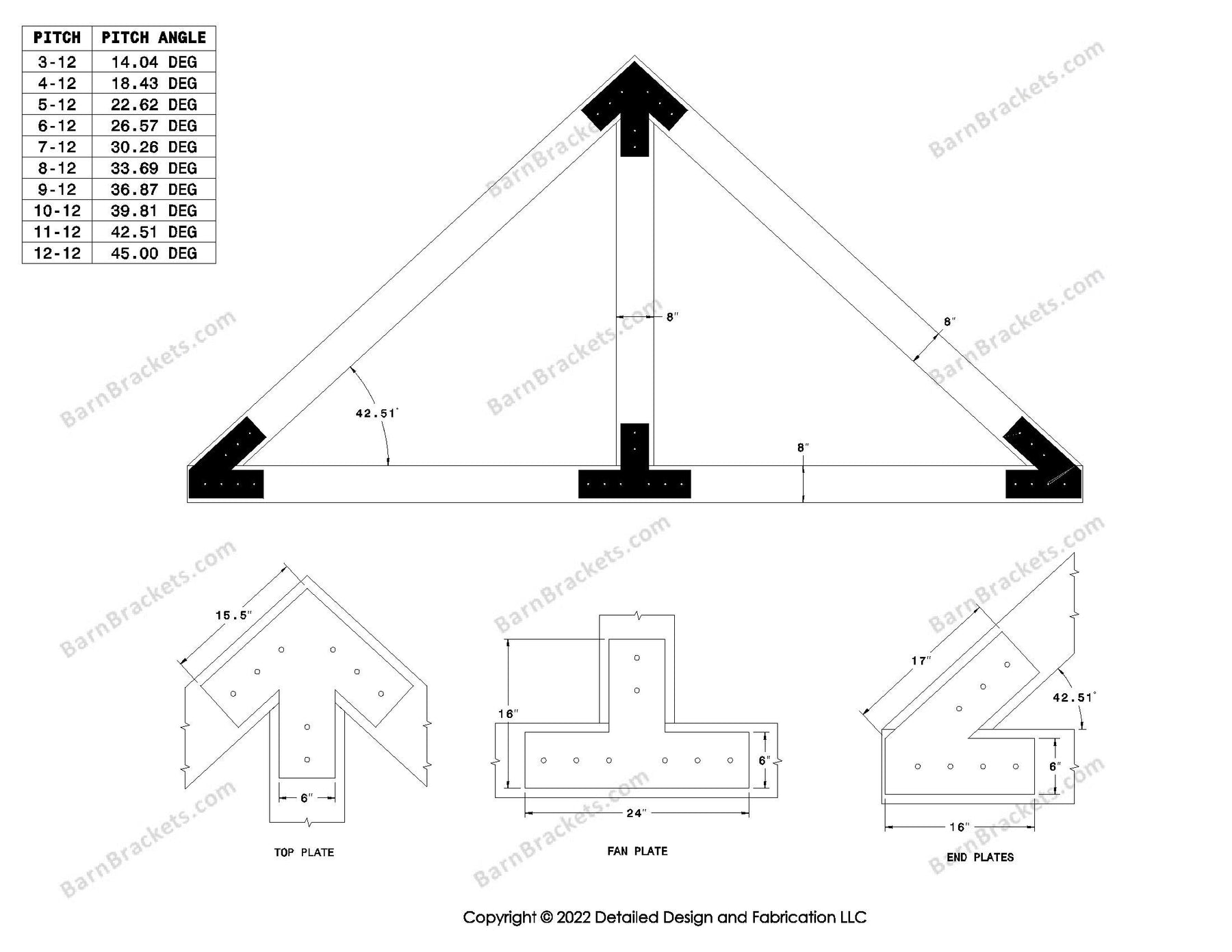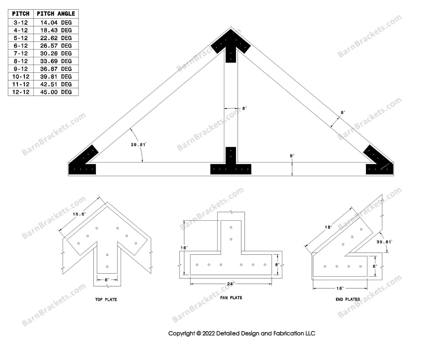 6 inch steel bracket kits for a post and beam truss.  These brackets are for 8 inch timber beams.  King post only truss.  Designed with flush ends and square corners.  Dimensions are for a 3-12 pitch roof.