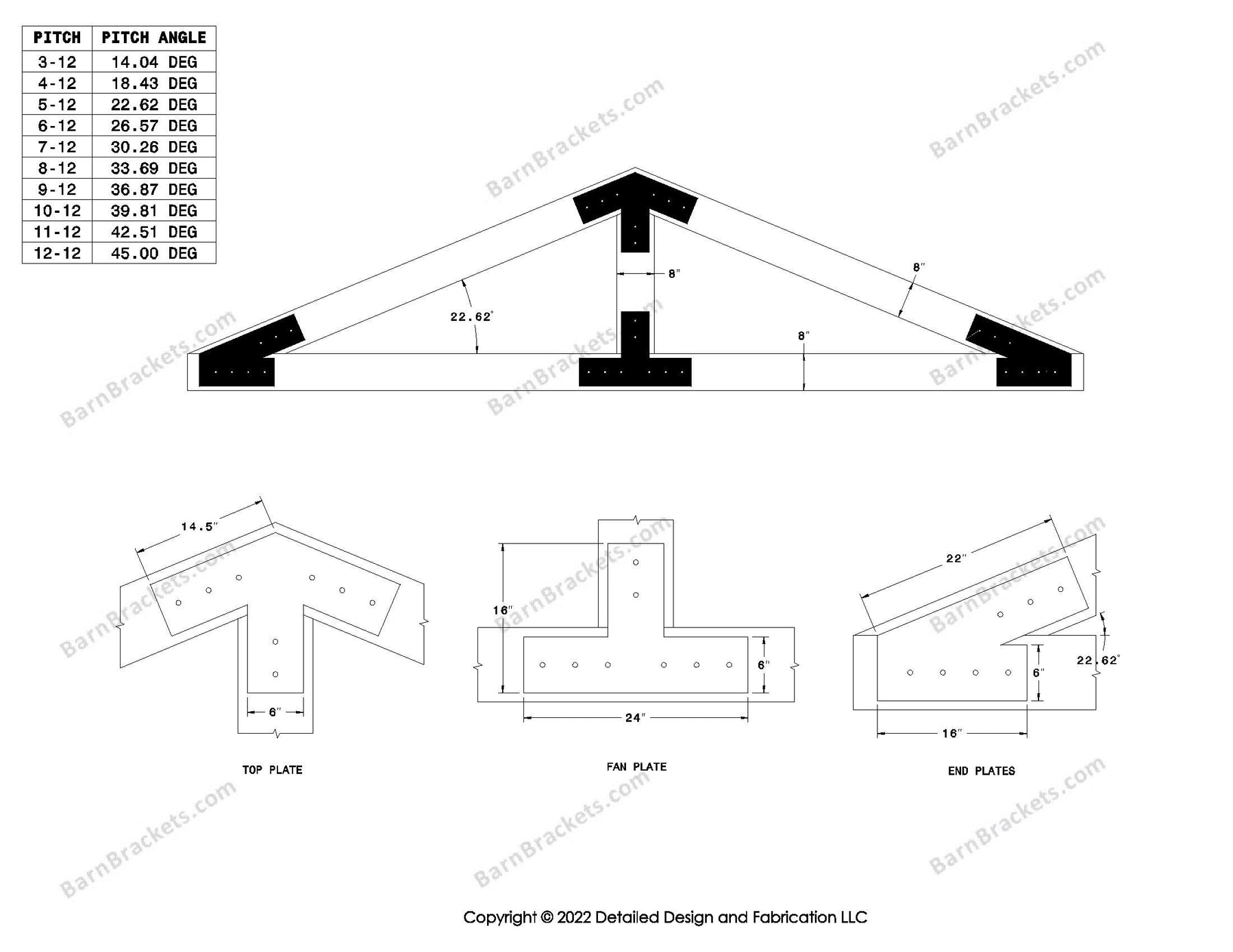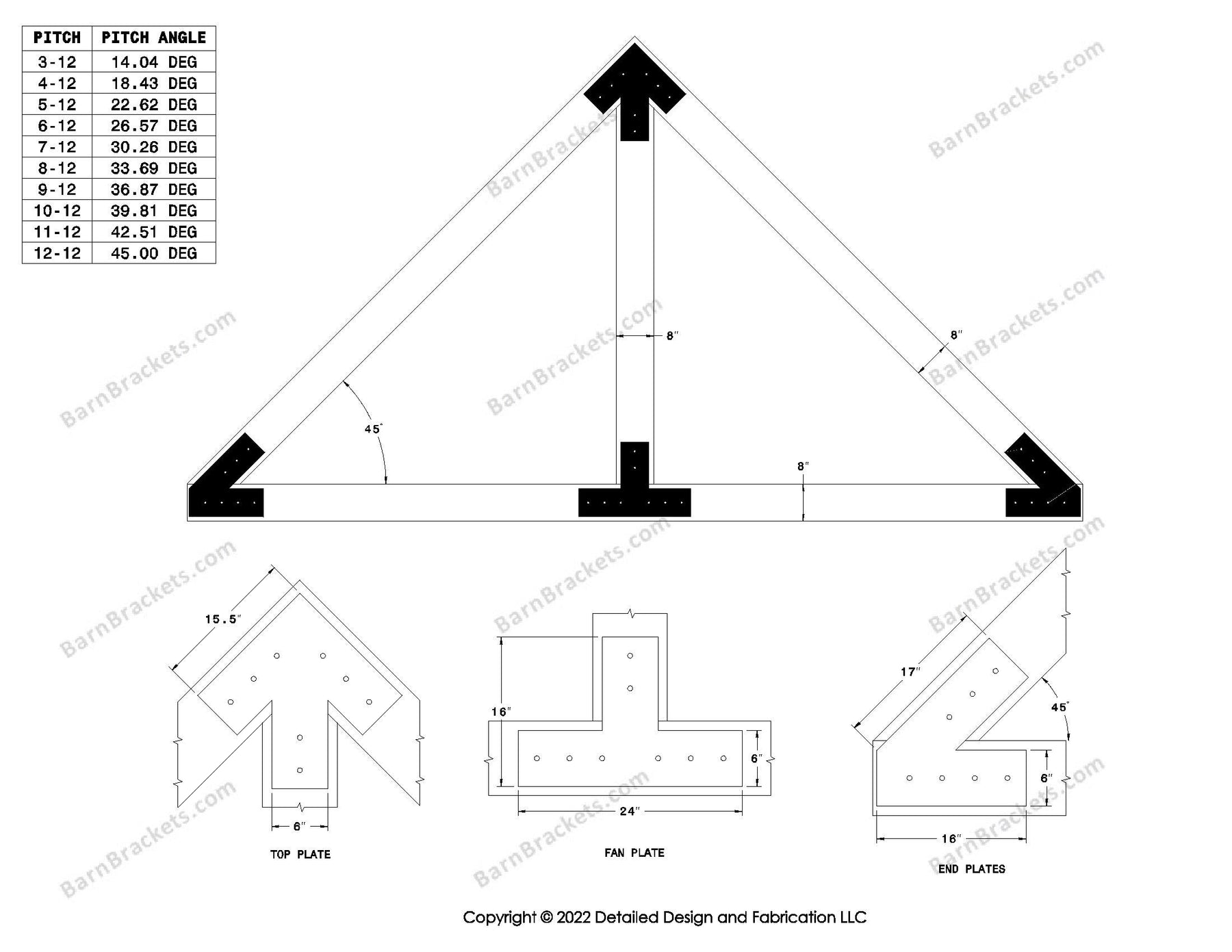 6 inch steel bracket kits for a post and beam truss.  These brackets are for 8 inch timber beams.  King post only truss.  Designed with flush ends and square corners.  Dimensions are for a 12-12 pitch roof.