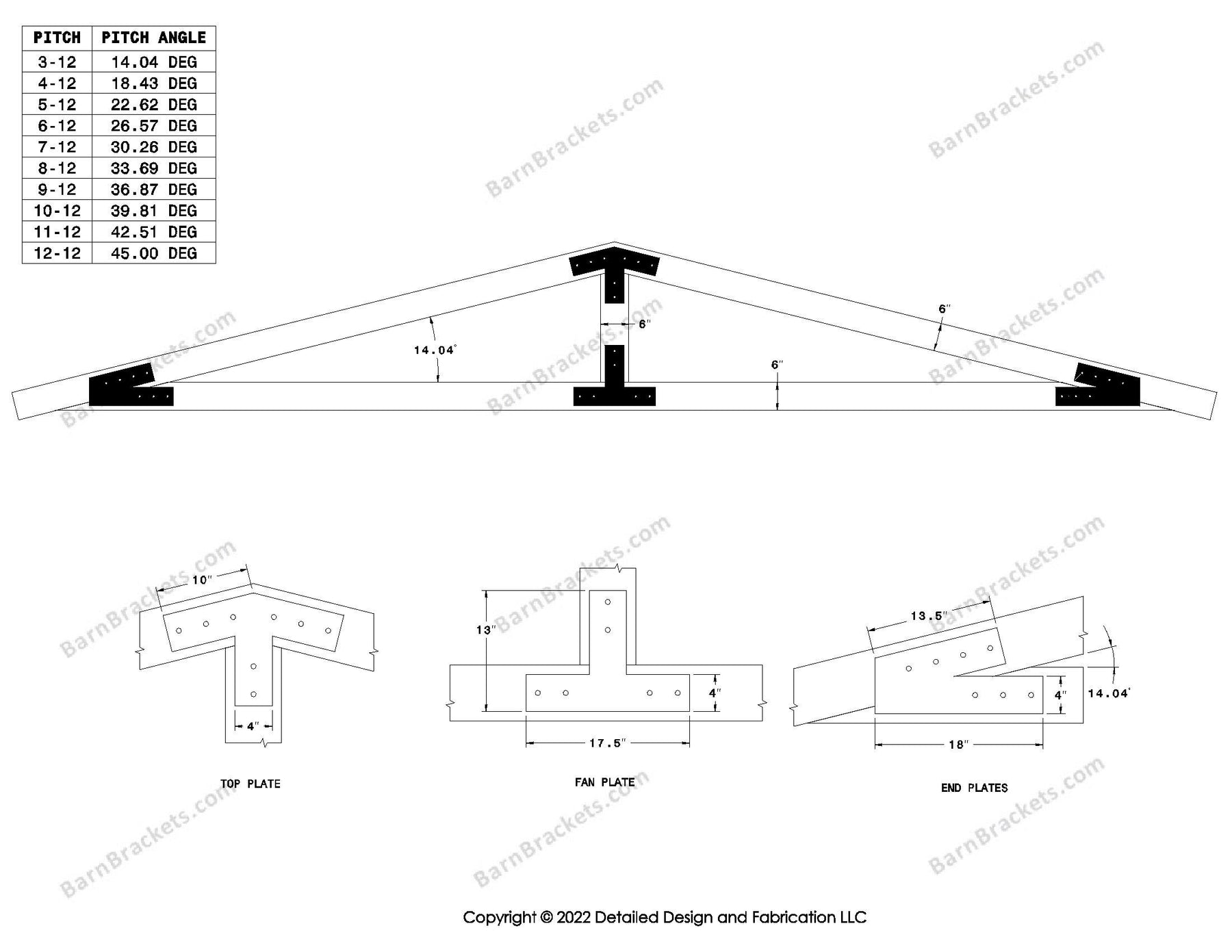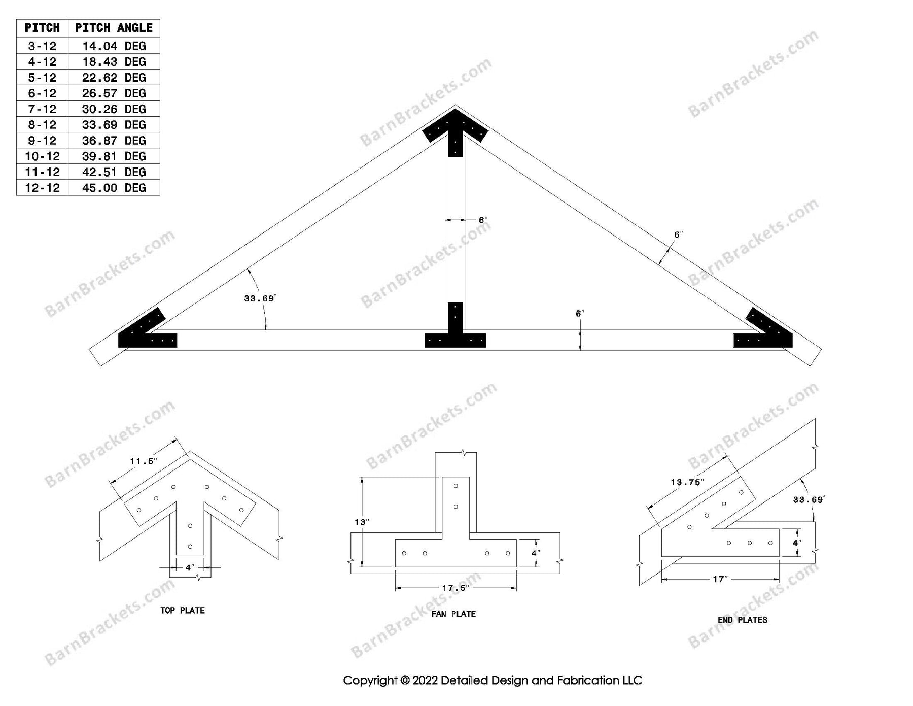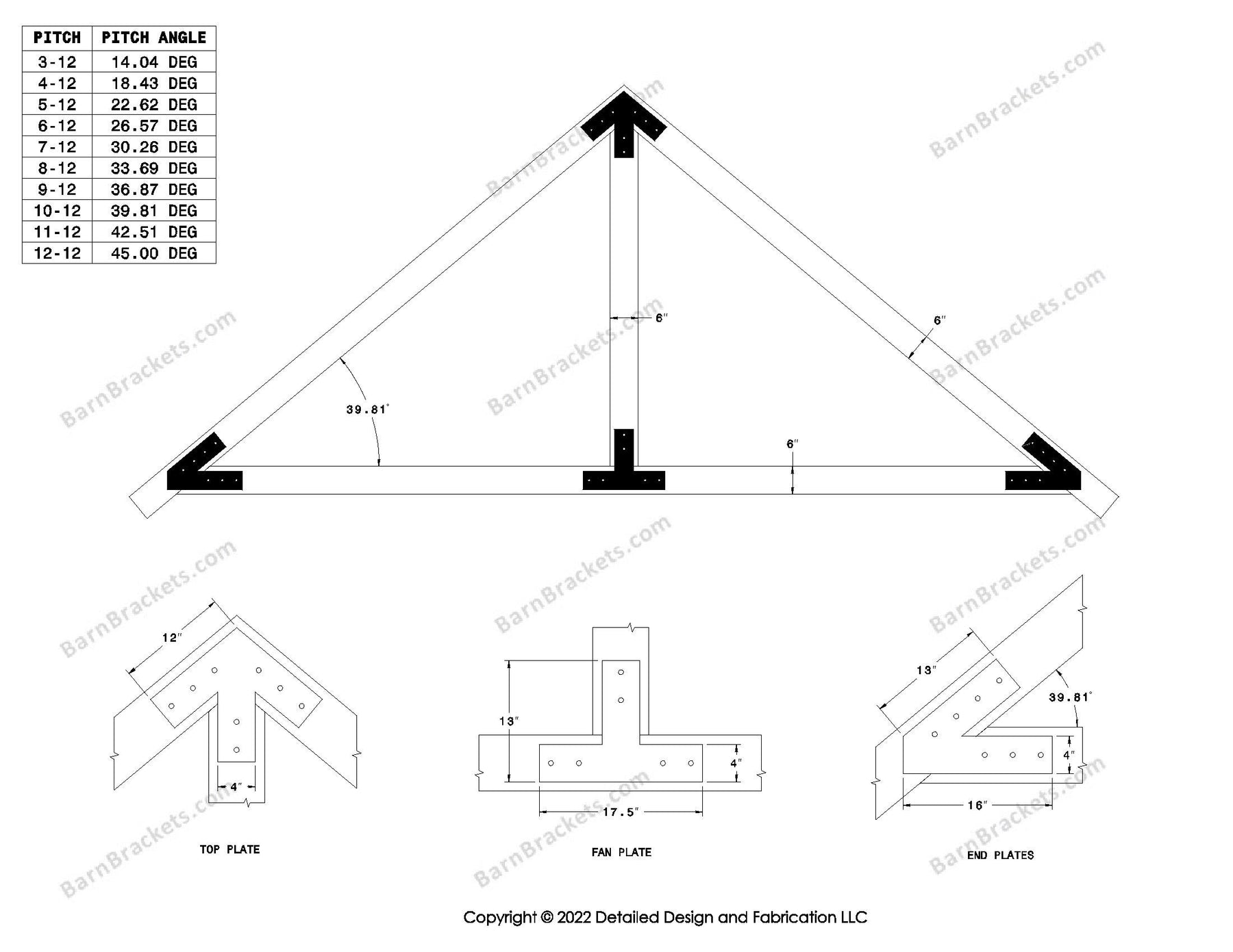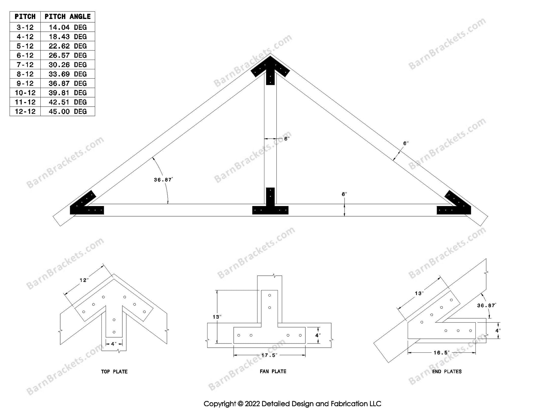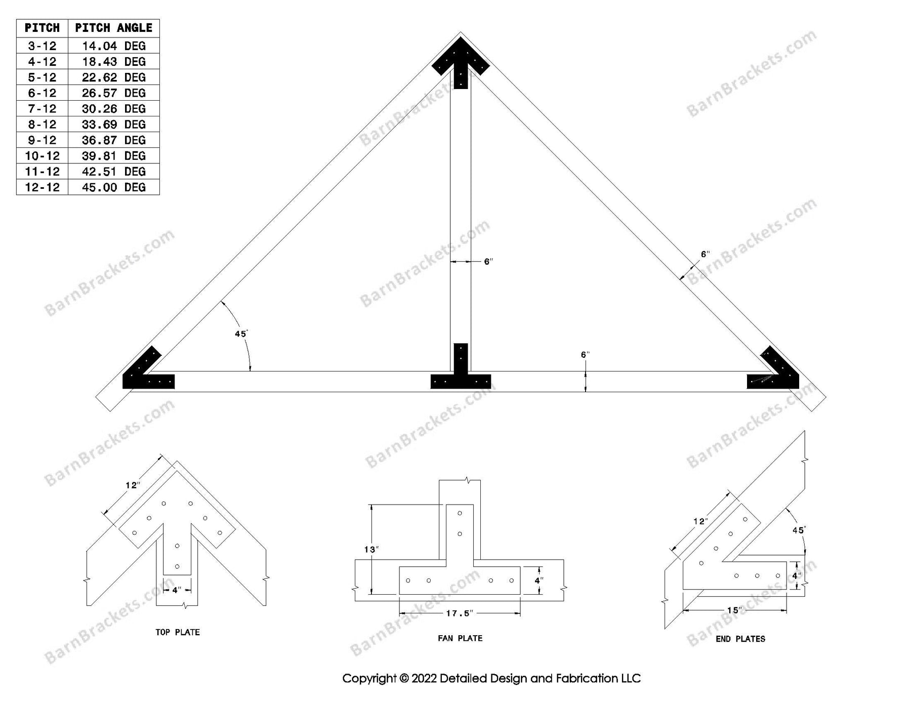 4 inch timber truss plate set for 6 inch wood beams 3-12 pitch.  King post only truss with overhang ends and square corners.