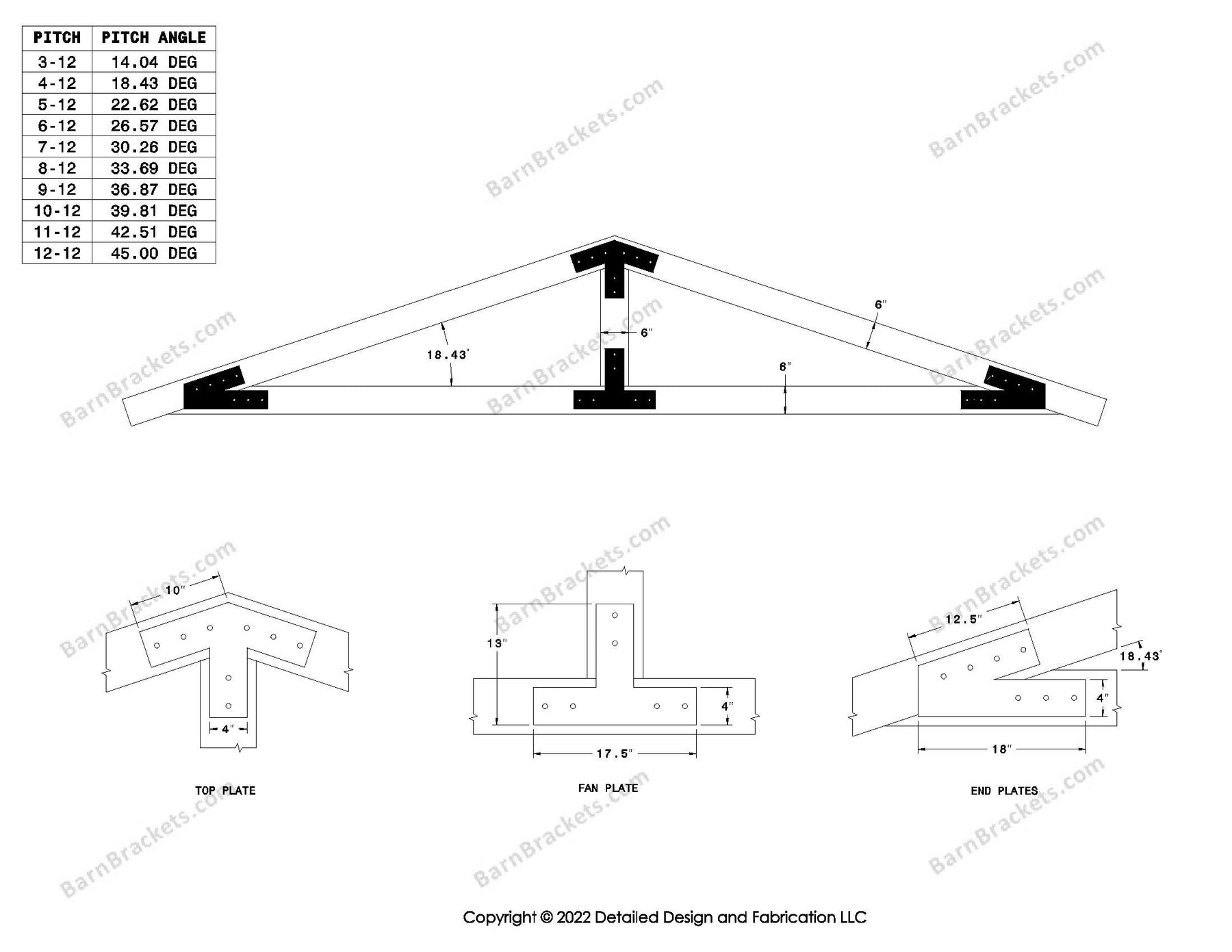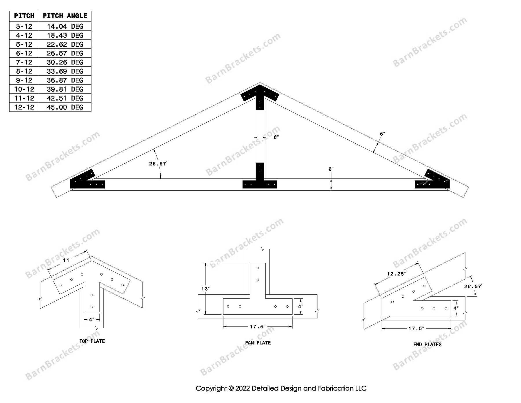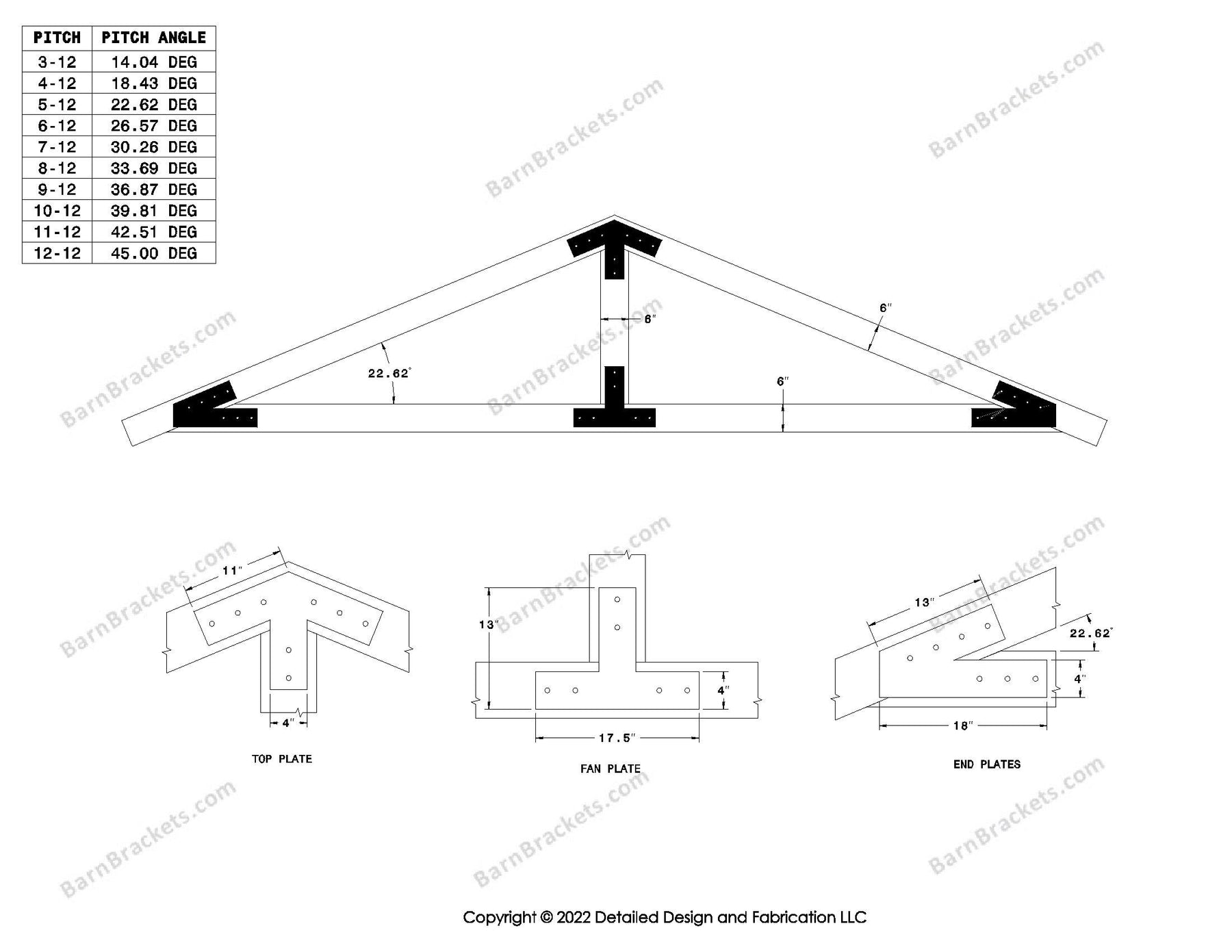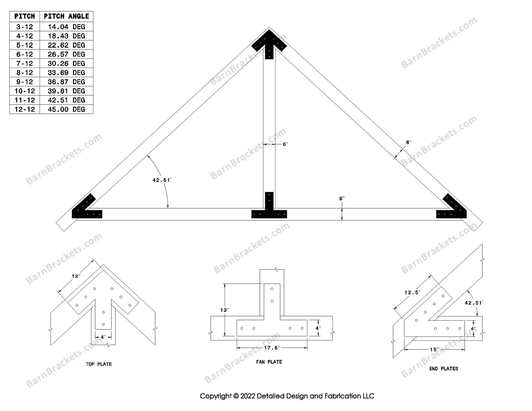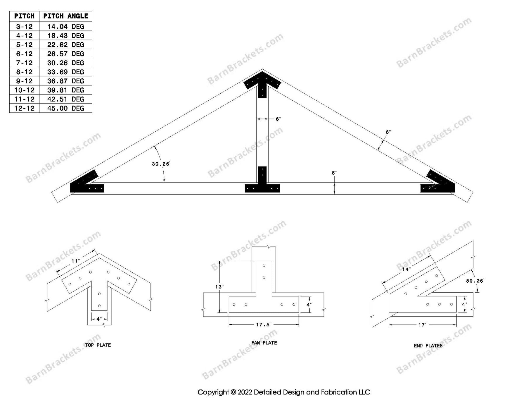 4 inch timber truss plate set for 6 inch wood beams 8-12 pitch.  King post only truss with overhang ends and square corners.